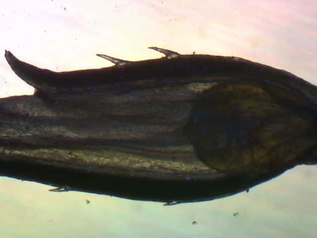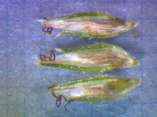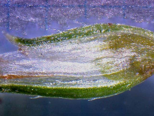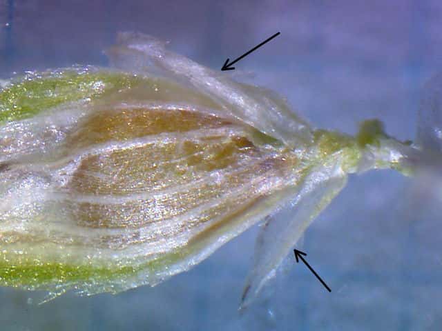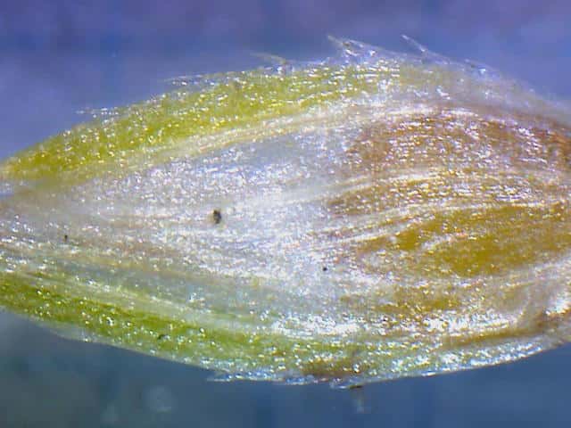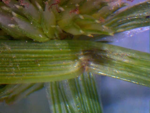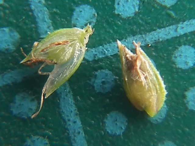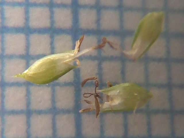 | ▼花序が3個ある。 | ▼小穂は長さ約2.7mm、中に果実が見える。 | ▼果実は上から2番目の鱗片の中にある。 |