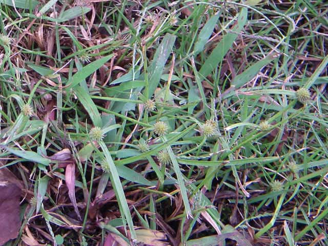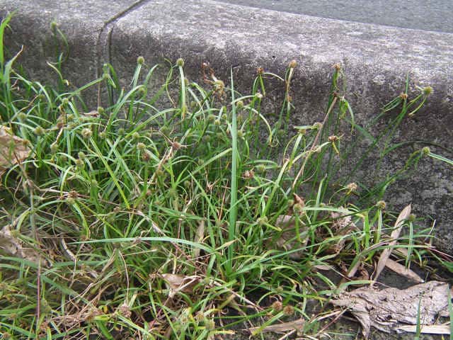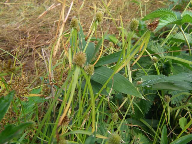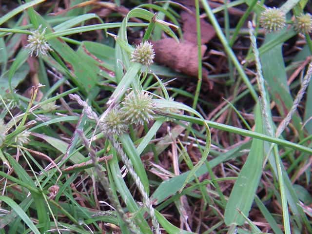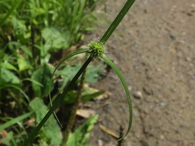 | 1年草 千葉県以西〜九州の路傍や休耕田などに多い。横に長くのびる赤みを帯びた根茎を持つ。稈は直立し、高さ15〜30cm。葉は柔らかく扁平、幅2〜3mm、やや平滑。基部の鞘は褐色または赤褐色を帯びる。花序は球状、無柄、径5〜12mm、密に多数の小穂をつけ緑色。苞葉の葉身は2〜4枚つき、葉状で長い。小穂は長さ3〜3.5mm、長楕円形、完熟すると基部から脱落する。小穂は4個の鱗片からなり、上方の2個が大きく、下方の2個は小さく、上から2番目の鱗片に両性花がつき結実する。下方の2個の鱗片は苞葉と前葉に相当する。鱗片は卵形で尖り先端はわずかに反曲し、膜質、淡緑色で細脈がある。鱗片の竜骨には数個の小刺がある。そう果は広倒卵形で長さは鱗片の約1/2。花柱はそう果とほぼ同長。柱頭は2個。花期は7〜10月。(岡山県カヤツリグサ科植物図譜) 学名は、Cyperus brevifolius var. brevifolius カヤツリグサ科カヤツリグサ属 よく似たものにヒメクグがあり、鱗片に刺がない。 |