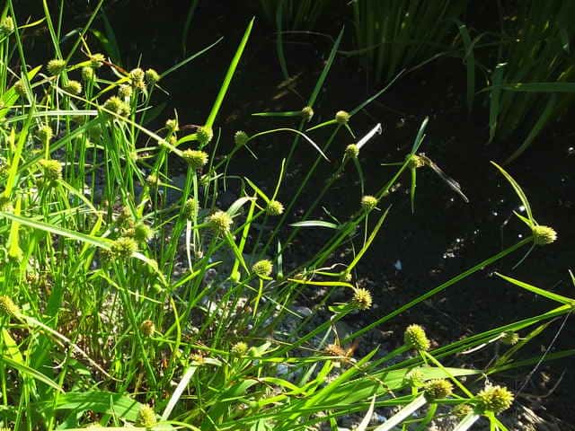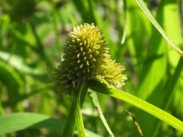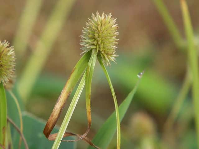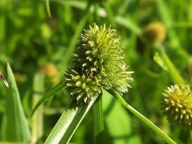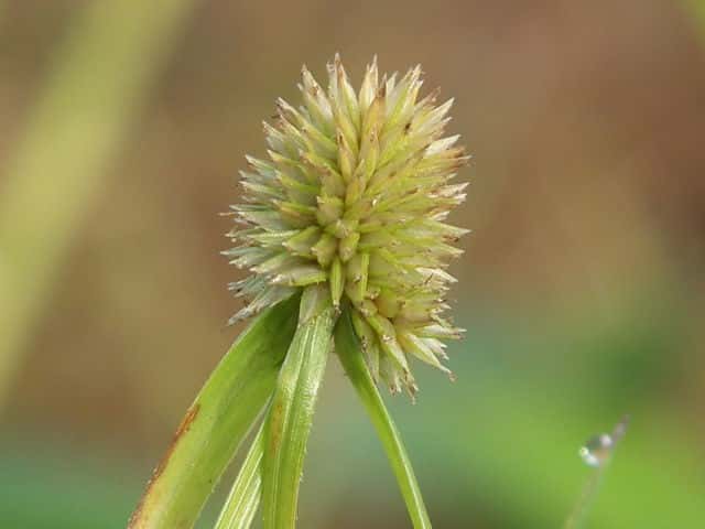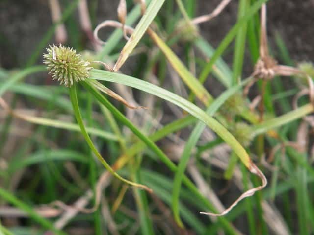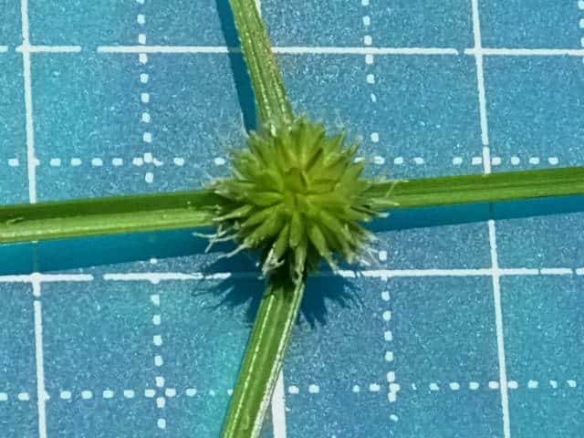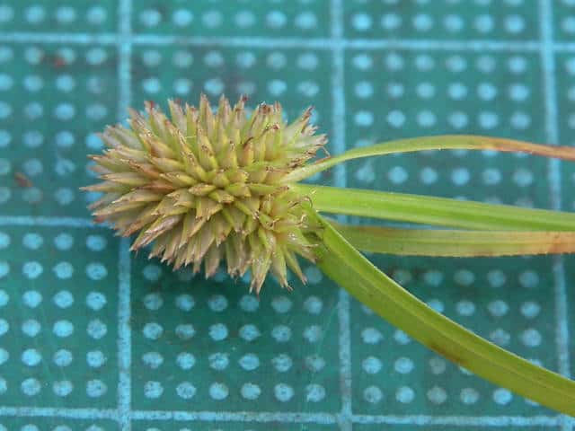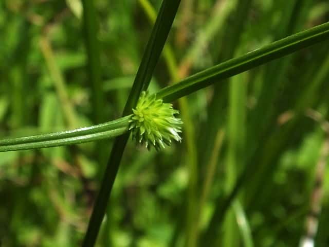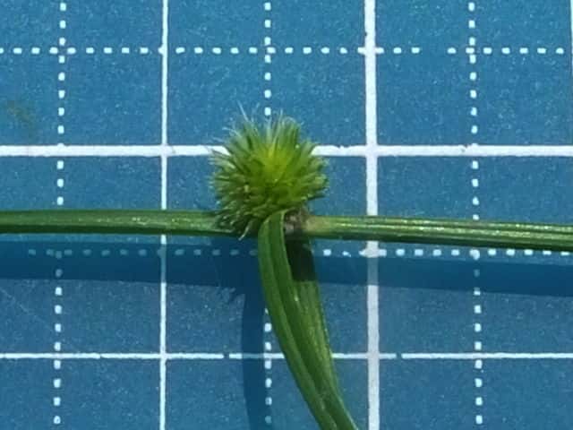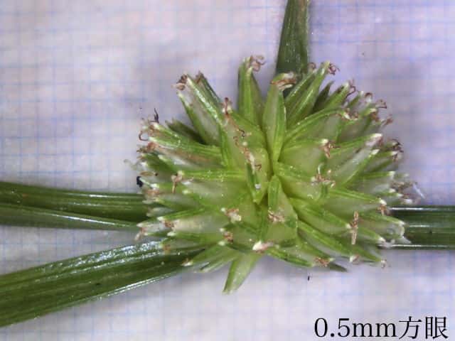 | ▼花序は直径約5mmの球形になっている。 | ▼小穂は長さ約3mm。柱頭は2岐。 | ▼小穂の基部に小さな鱗片が2枚ある。 |