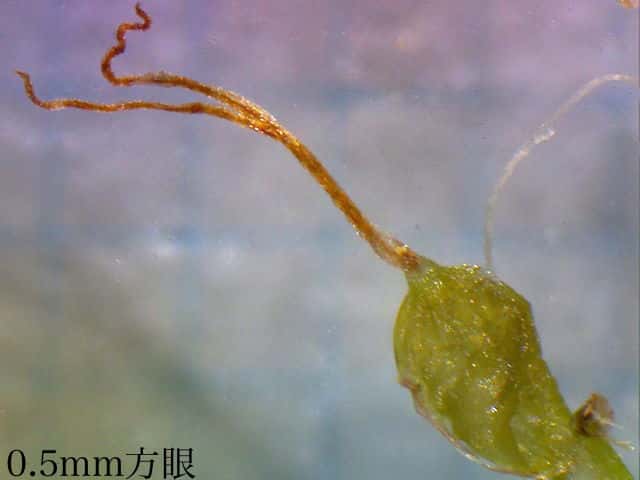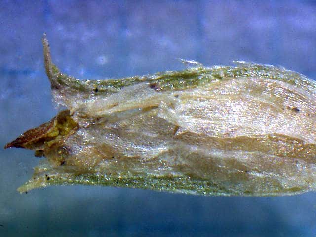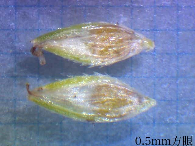 | ▼鱗片の竜骨に刺がある。 | ▼大きな鱗片の基部に小さな鱗片が2個ある。 | ▼柱頭は2岐、果実は長さ約1mm。 |