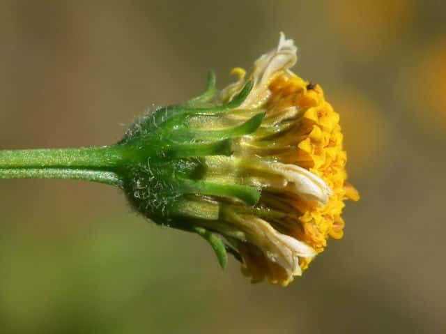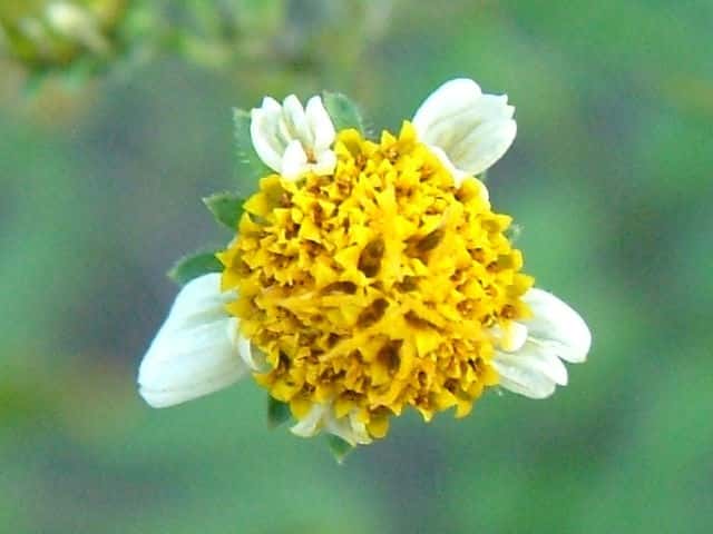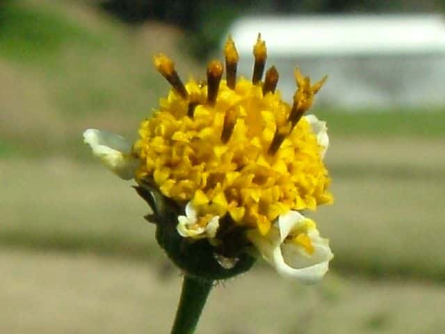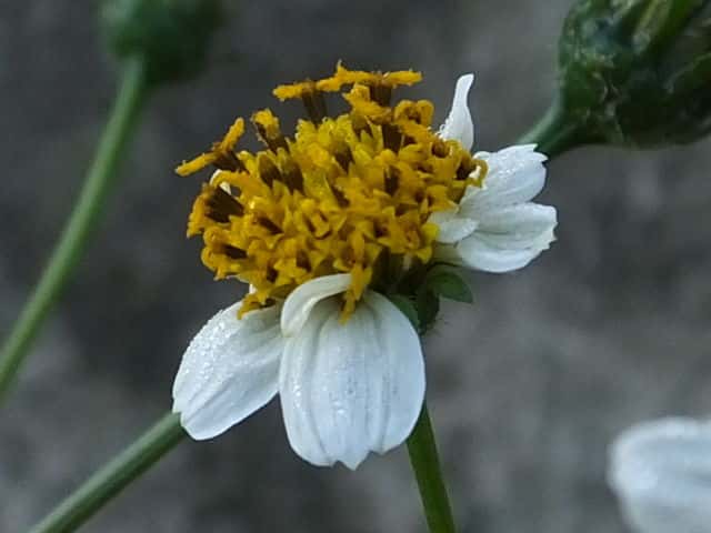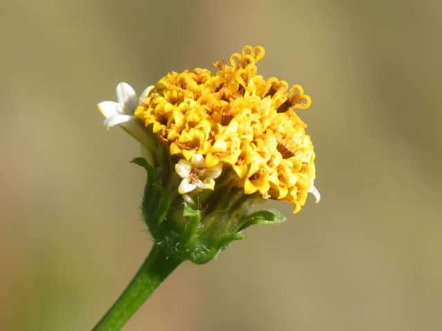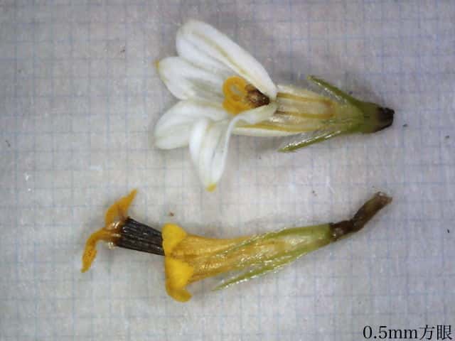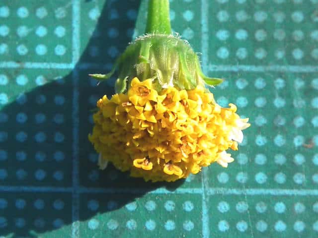 | ▼花は直径約1.5cm。 | ▼筒状花(下)と白化した筒状花(上)。 | ▼白化した筒状花も両性花のようだ。 |