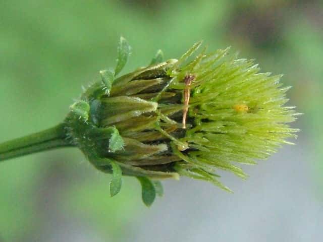 | ▼若い果実。 | ▼果実は長さ約9mm、冠毛が3〜4個ある。 | ▼果実に上向きの毛がある。 |