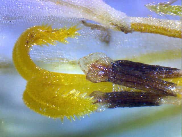 | ▼白化した筒状花、3本の冠毛がある。 | ▼花筒を開くと、集葯雄しべが見える。 | ▼毛のある雌しべの柱頭と葯筒。 |