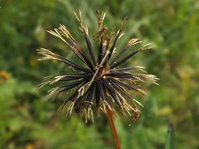 | ▼集合果は直径約3cm。 | ▼果実は冠毛を含めて長さ約1.5cm。 | ▼上部に刺のある冠毛がある。3本が多い。 |