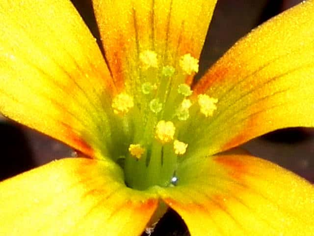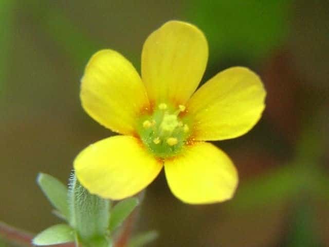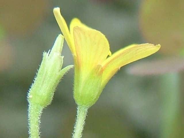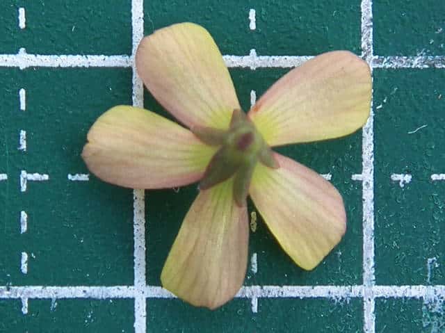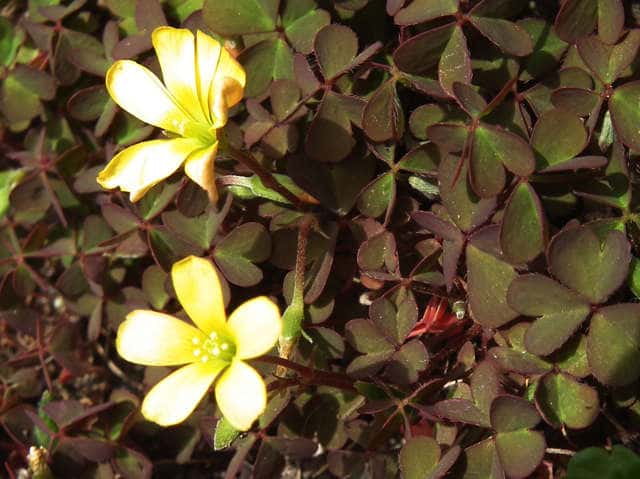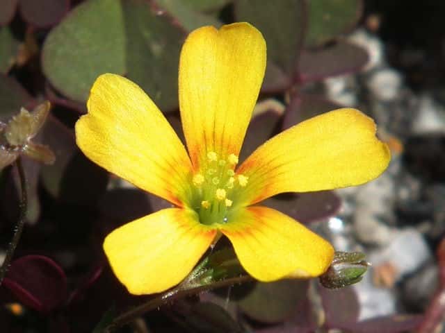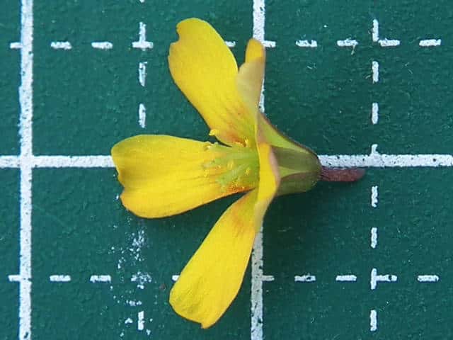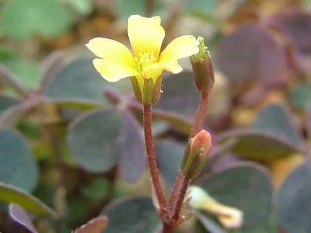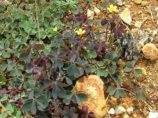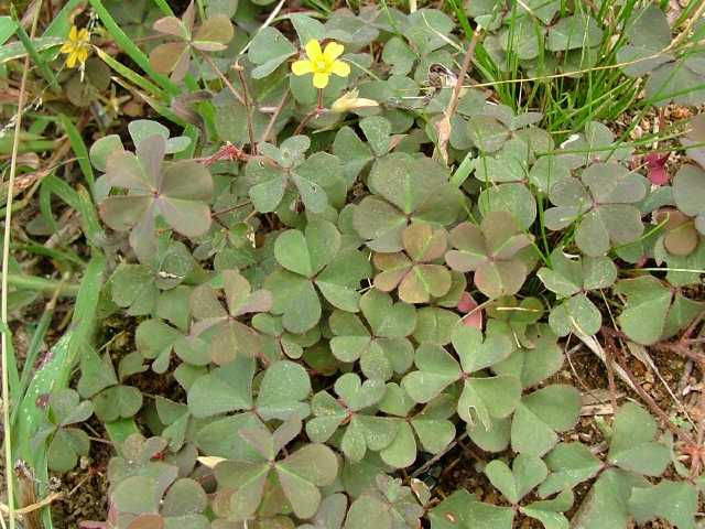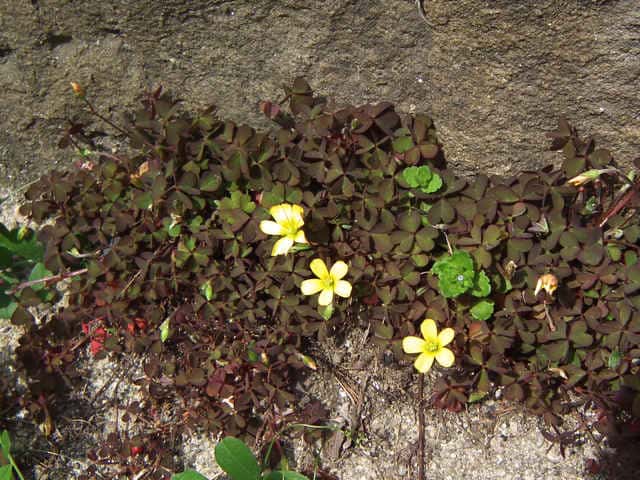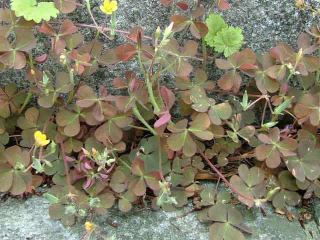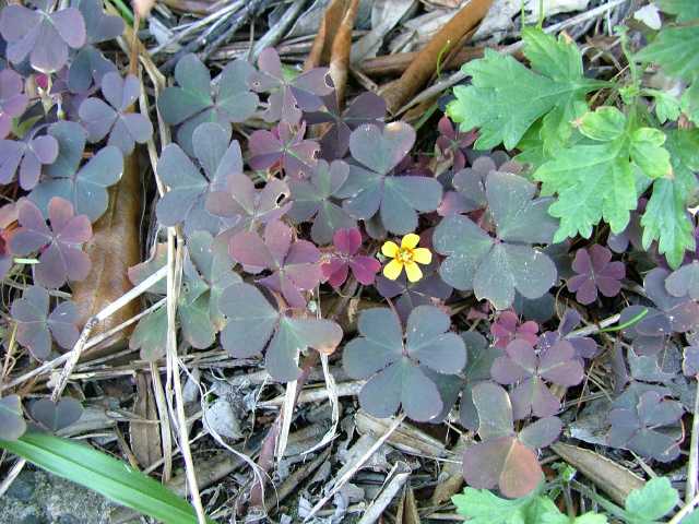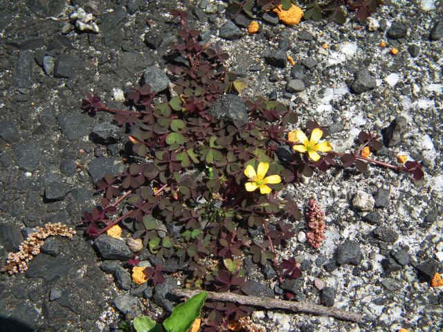 | 多年草 カタバミの1品種。日本各地の道端などの乾燥した場所に生える。茎はよく枝分かれし、下部は地面をはい、上部は立ち上がる。葉は3小葉で赤紫色を帯びる。葉の脇から散形花序を出し、径8mmぐらいの黄色の花をつける。中心部が赤くなることが多い。果実はさく果、長さ約2cmの円柱形で熟すと多数の種子をはじきとばす。種子は淡褐色、長さ約1.5mmの広卵形で、表面に横みぞが7本ある。花期は5〜9月 学名は、Oxalis corniculata f. rubrifolia カタバミ科カタバミ属 葉が緑色のものはカタバミ、また中間の色合いのものをウスアカカタバミという。 葉の表面や茎にも毛が多いものをケカタバミという。 |