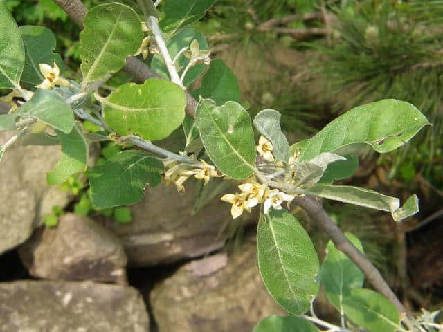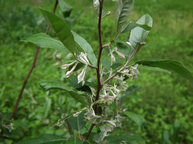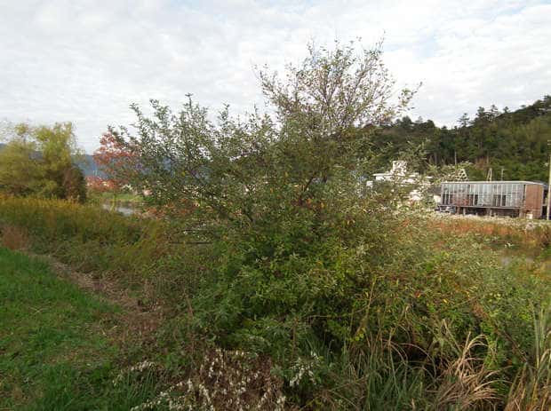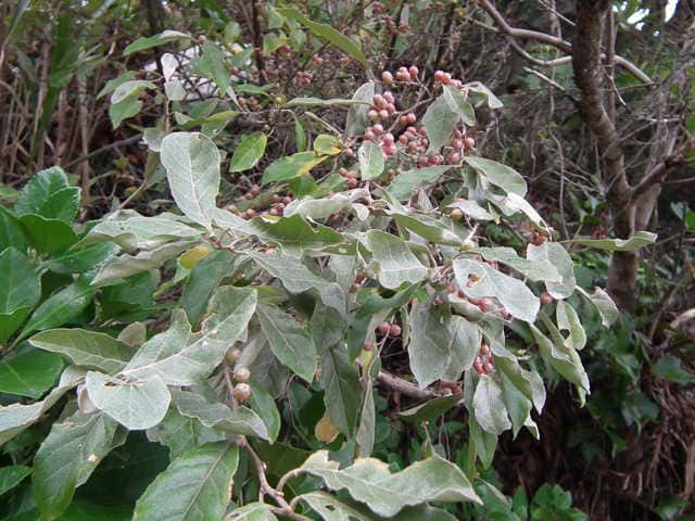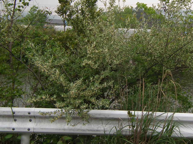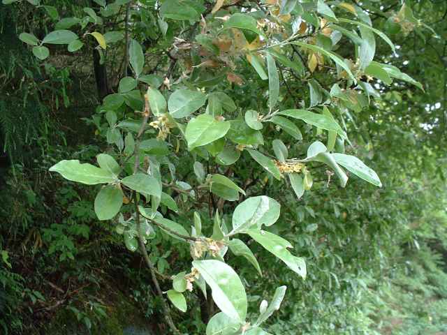 | 落葉低木 北海道渡島半島〜九州の河原や原野、道ばた、川岸など、日当たりのよいところに生える。高さ2〜3m、大きいものは高さ5m、直径20cmほどになる。樹皮は灰黒色。本年枝は銀色の鱗状毛が密生して白い。葉は互生。葉身は長さ4〜8cm、幅1〜2.5cmの長楕円形〜披針形。先は鈍く、基部はくさび形。縁は全縁。室は薄く、表面には銀色の鱗状毛がある。鱗状毛は果実が熟す頃には脱落する。裏面は銀色の光沢のある鱗状毛に覆われ、褐色または淡褐色の鱗状毛がまばらにある。葉柄は長さ5〜10mm、銀色の鱗状毛が密生する。葉腋に1〜6個の花が垂れ下がってつく。花ははじめ白色で、しだいに黄色を帯びる。萼筒は長さ5〜7mm、子房の上部で少しくびれる。萼片は4個、長さ約4mmの三角形で、先は鋭くとがる。花柄は長さ3〜5mm。萼筒、萼片、子房、花柄には銀色の鱗状毛が密生する。果実は偽果。直径6〜8mmの球形〜楕円状球形で、9〜11月に赤く熟す。表面には赤褐色や白色の鱗状毛がある。果柄は短く、直立または湾曲する。種子は長さ4〜5mmの楕円形で、表面に溝が8個ある。花期は4〜5月。 冬芽の頂芽は長さ5mmほど。幼葉が3〜4個あり、褐色の鱗状毛に覆われ、銀色の鱗状毛が少し混じる。側芽はやや小さい。(樹に咲く花) 学名は、Elaeagnus umbellata グミ科グミ属 葉の表面に星状毛のある変種のカラアキグミや、海岸には変種のマルバアキグミがある。 |