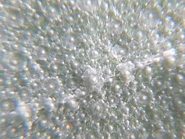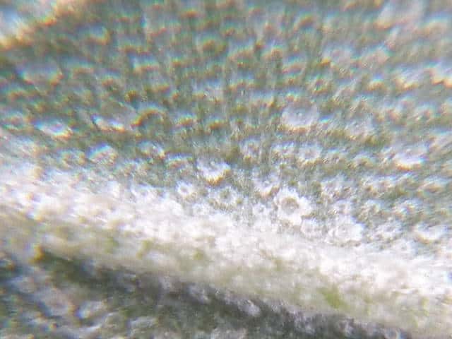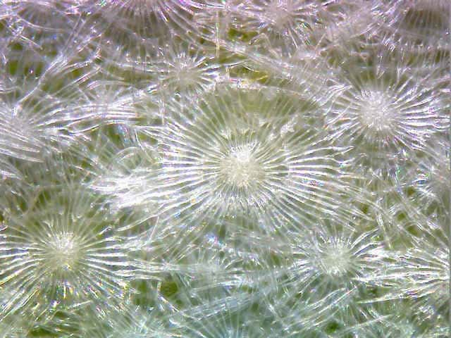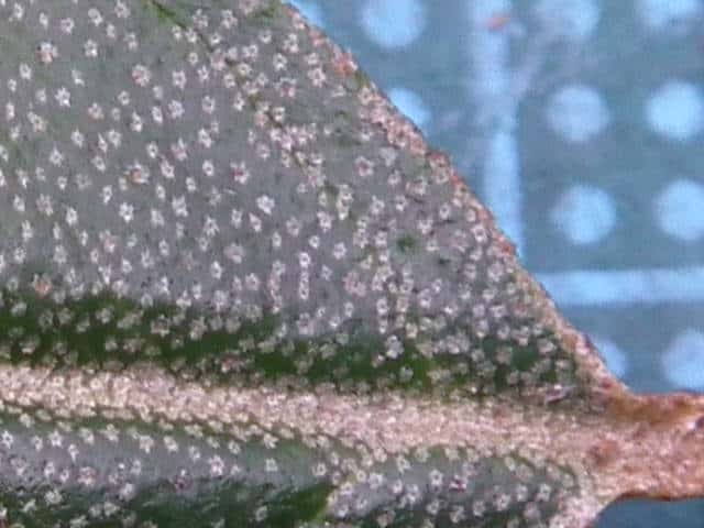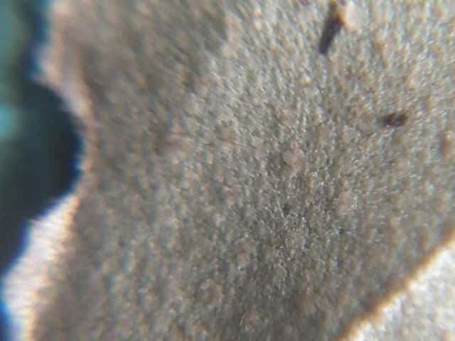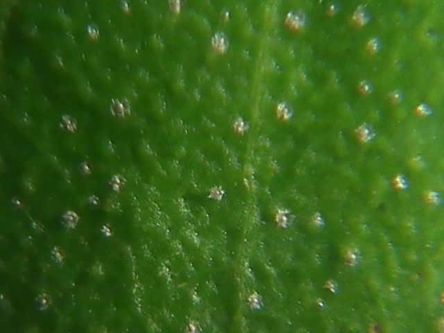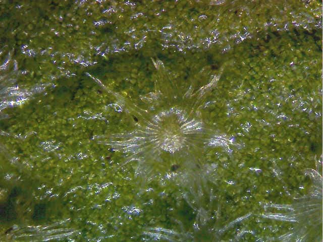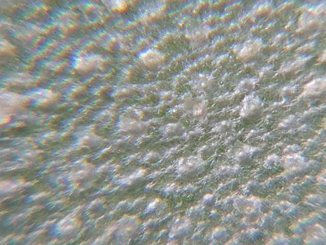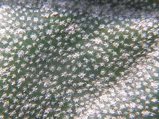 | ▼表面の鱗状毛の拡大。 | ▼裏面は褐色を帯びた白色。 | |