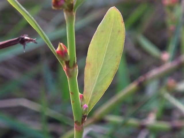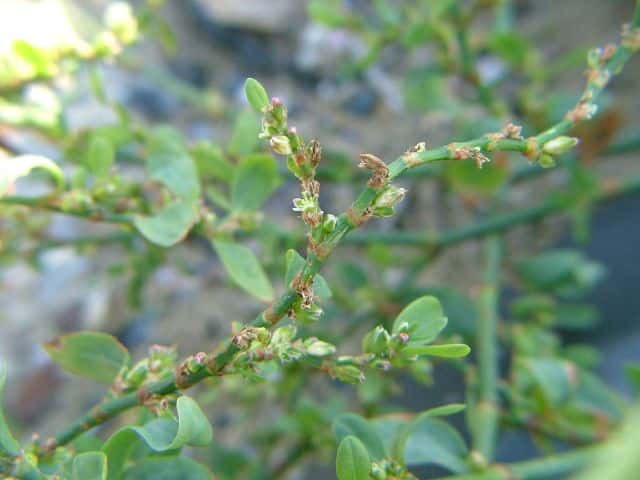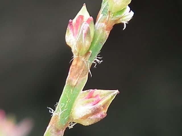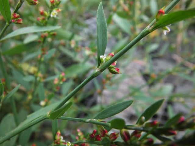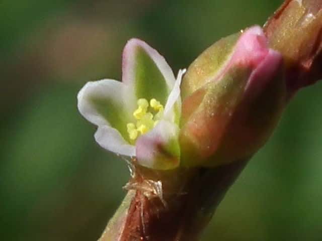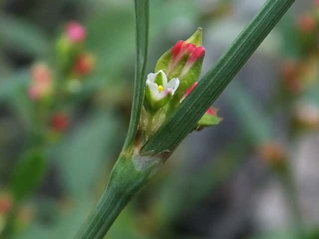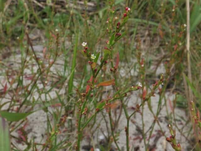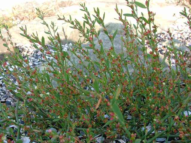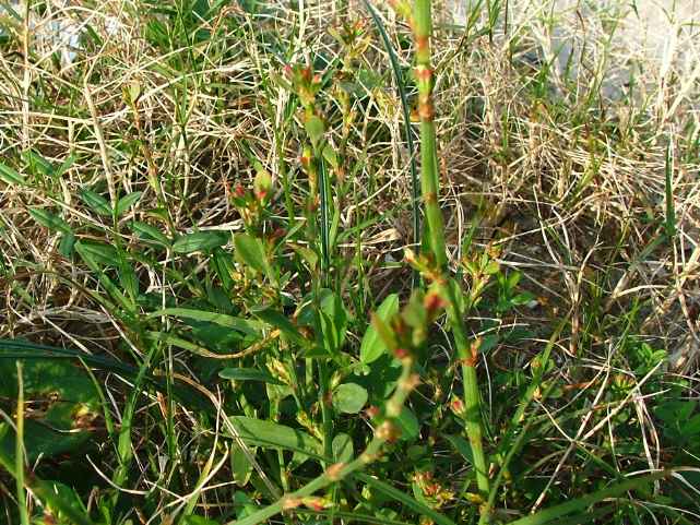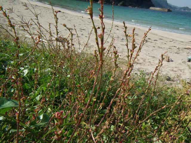 | 1年草 北海道〜九州の海岸に生える。高さ約80cm。葉は長さ0.5〜3cmの長楕円形〜倒披針形で、乾くと暗褐色を帯びる。花は葉腋に2〜3個ずつ束生する。茎の上部では葉が小さく落ちやすいので、穂状花序のように見える。花被は長さ1.5〜3mmあり、5裂する。そう果は長さ約3mmの3稜形で、花被に包まれるが、先端は花被からつきでる。花期は9〜10月。(野に咲く花) 学名は、Polygonum polyneuron タデ科ミチヤナギ属 痩果は小形(長さ約3㎜)と大形(長さ約4㎜)の2形あり、3稜形、ときに3面が不揃い。大形の痩果は頭部が花被から突き出るが、小形は突き出ない。(三河の植物観察) 似た仲間にミチヤナギがあり、果実は花被にほとんど包まれる。 |