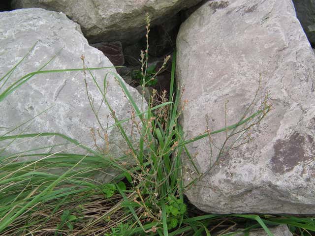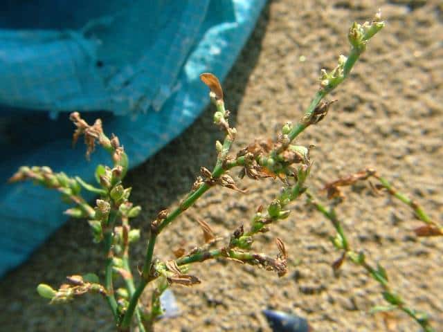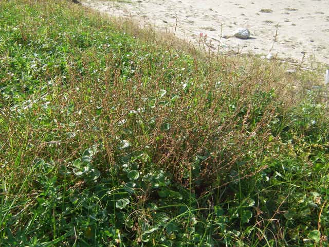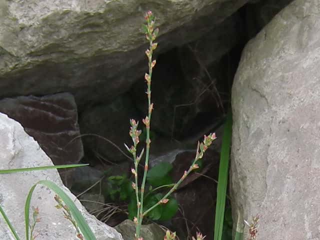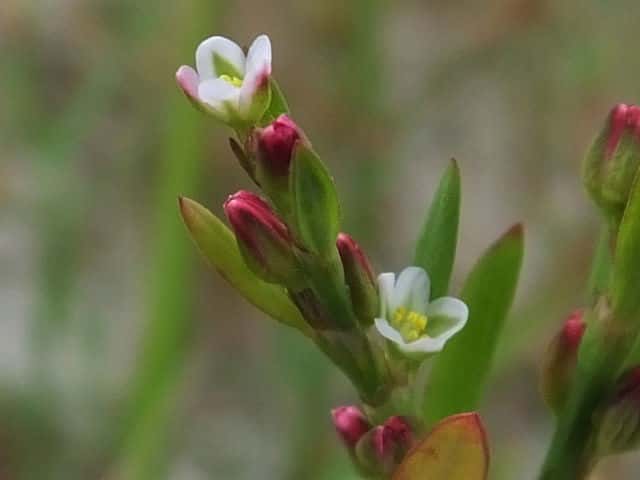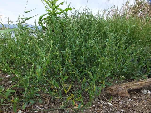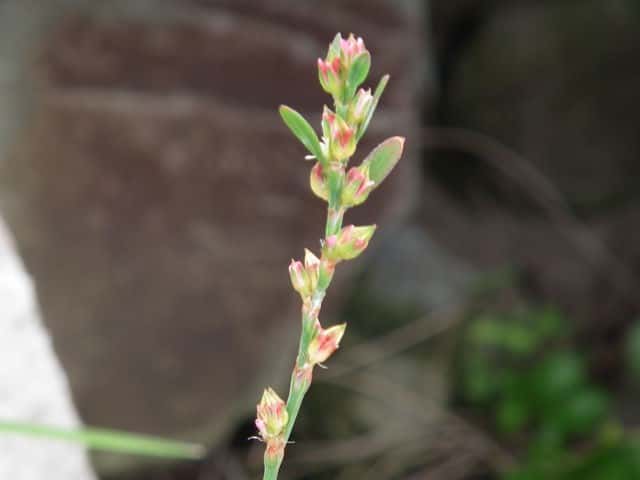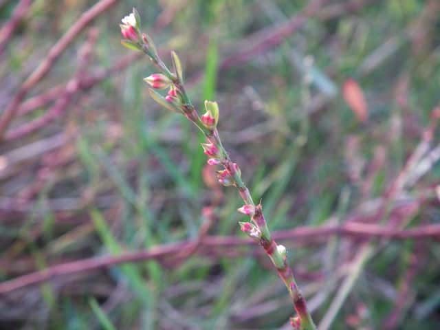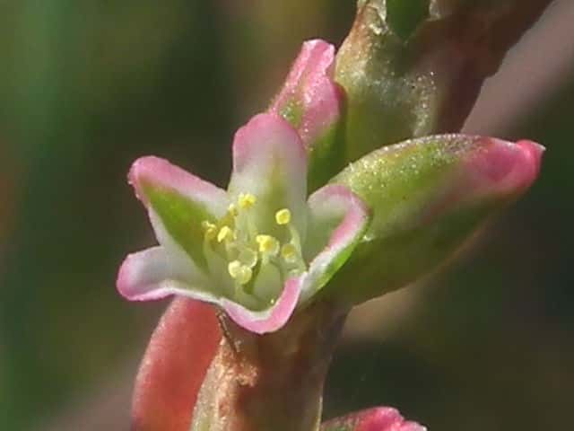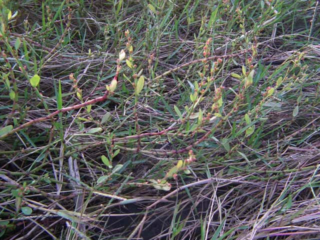| 1年草 北海道〜九州の海岸に生える。高さ約80cm。葉は長さ0.5〜3cmの長楕円形〜倒披針形で、乾くと暗褐色を帯びる。花は葉腋に2〜3個ずつ束生する。茎の上部では葉が小さく落ちやすいので、穂状花序のように見える。花被は長さ1.5〜3mmあり、5裂する。そう果は長さ約3mmの3稜形で、花被に包まれるが、先端は花被からつきでる。花期は9〜10月。(野に咲く花) 学名は、Polygonum polyneuron タデ科ミチヤナギ属 痩果は小形(長さ約3㎜)と大形(長さ約4㎜)の2形あり、3稜形、ときに3面が不揃い。大形の痩果は頭部が花被から突き出るが、小形は突き出ない。(三河の植物観察) 似た仲間にミチヤナギがあり、果実は花被にほとんど包まれる。 |
