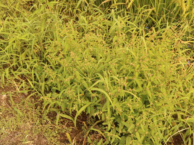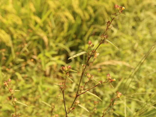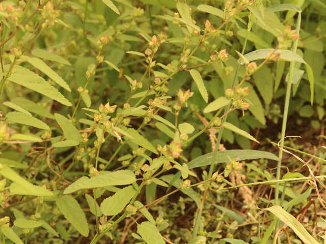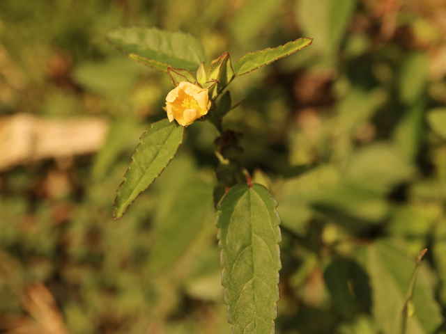 一年生ときに多年草 熱帯アメリカ原産。茎は木質でしなやか、星状毛を布く。よく分岐して直立し、高さ1.5mに達する。葉は長楕円形、ほぼ無毛で全体に鋸歯があり、短い葉柄で互生する。葉柄基部には線形の托葉がある。茎の頂と葉腋に直径1.5cmほどの黄色の5弁花を着ける。果実は5つに分かれ、分果は2本の突起を持つ。花期は9〜11月。(日本帰化植物写真図鑑) 類似種のキンゴジカは花柄が1〜4cmと長く、分果が7〜14個と多い。 学名は、Sida cordifolia アオイ科キンゴジカ属 |