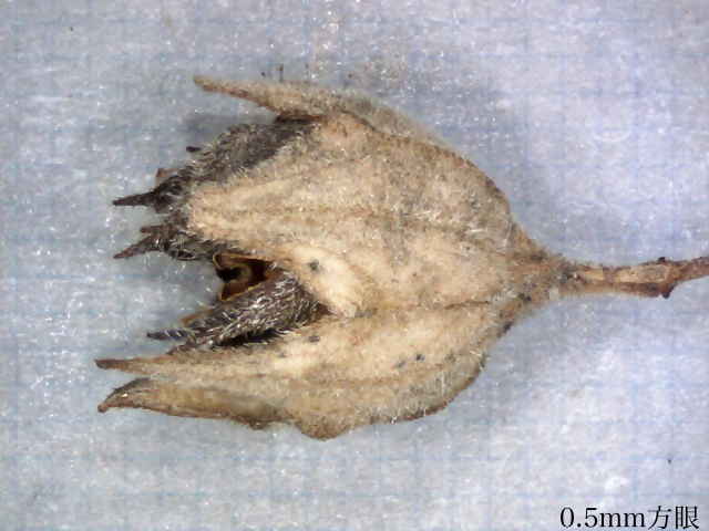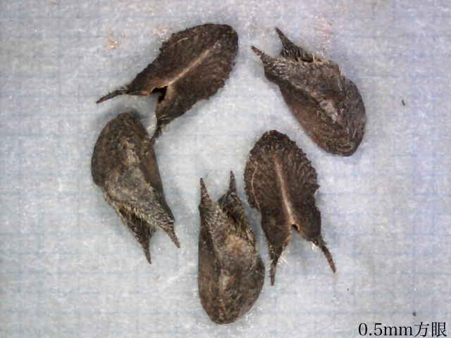 | ▼萼には星状毛が密生する。 | ▼分果は長さ約4mm。 | ▼分果には2本の突起がある。 |