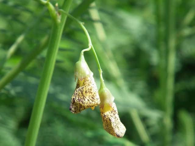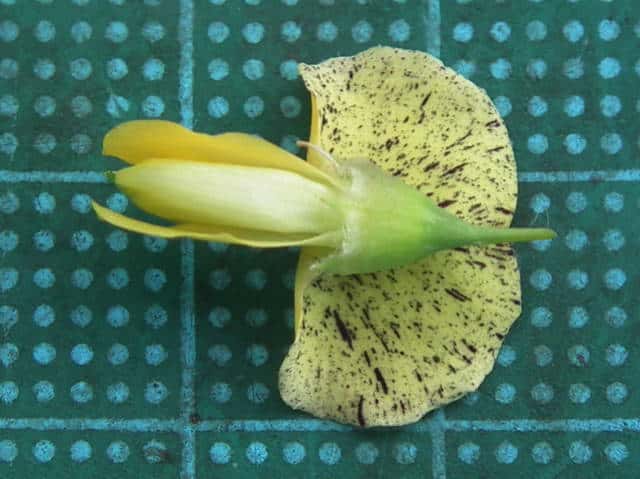 | ▼花は長さ約1.5cm。 | ▼旗弁の裏面には暗紫色の斑点がある。 | |