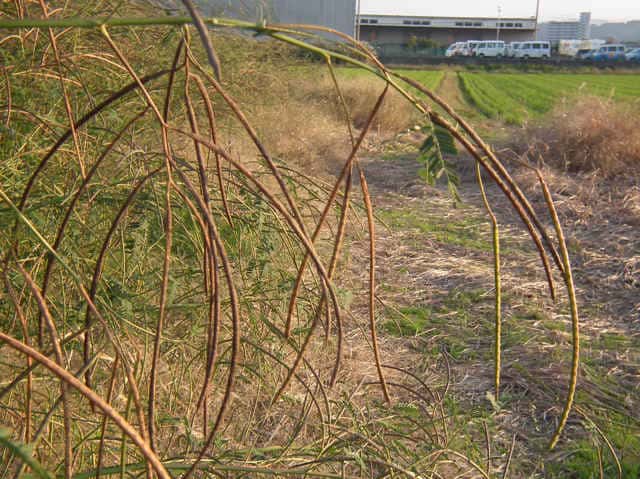 | 1年草 熱帯アメリカ原産。1953年に愛媛県松山市で見いだされ、本州中部以西に散発的に発生している。茎はあまり枝を出さずに直立して高さ1mほどになる。葉は長さ偶数羽状複葉で短い柄があって互生し、小羽片は先の丸い長円形。葉腋に葉より短い花序を出し、長さ2cmほどの黄色の蝶形花を数個、まばらにつける。花の外面はしばしば紫色を帯びる。莢果は長さ20cm、幅4mmほどになる。花期は夏〜秋。(日本帰化植物写真図鑑) 学名は、Sesbania exaltata マメ科ツノクサネム属 |