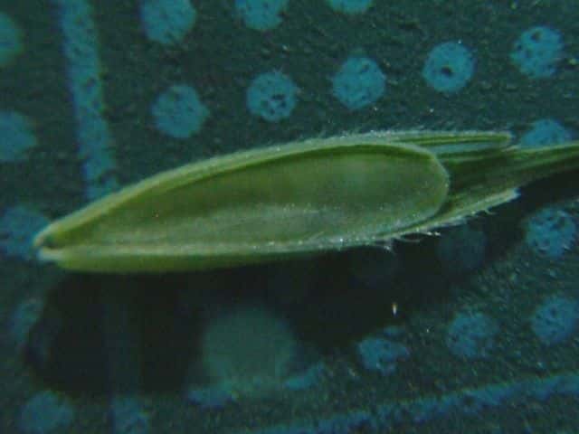 | ▼苞穎を取り除いた。 | ▼内穎が短く、先は丸い。 | ▼穎の表面に毛がある。 |