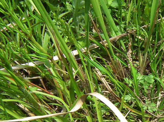 | 多年草 北海道〜九州の草地に普通に生える。密に叢生し、匐枝は出さない。基部の鞘は褐色でやや光沢があり、古くなると繊維に分解する。葉は有花茎とほぼ同長で、幅2〜3mm。有花茎は高さ15〜50cm。頂小穂は雄性で、多数の花をつけ棍棒状、長さ1〜2cm。側小穂は2〜3個で雌性、たがいに接近してつき、多数花を密生し、長さ1〜2cm、幅3〜4mm。苞はほとんど無鞘、葉身は花序と同長またはやや長い。根際に雌小穂をつけることはほとんどない。雌鱗片に長い芒がある。果胞には不明瞭な脈があり、長さ2.5〜3mm、まばらに毛がある。柱頭は3岐。果期は4〜5月。(日本のスゲ) 雄鱗片は長さ4〜5mm、半透明、光沢があり、短い芒がある。(岡山県スゲ属植物図譜) 学名は、Carex leucochlora カヤツリグサ科スゲ属ヌカスゲ節 よく似たメアオスゲは稈は高さ5〜20cm。最下の雌小穂が根際に根生状につく。苞は短いが明らかな鞘がある。雄鱗片に長い芒がある。ノゲヌカスゲは雄小穂が線形で雌小穂に隠れている。 |