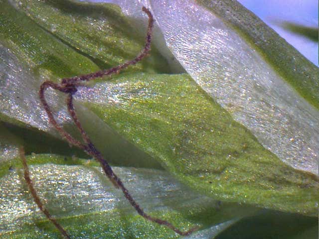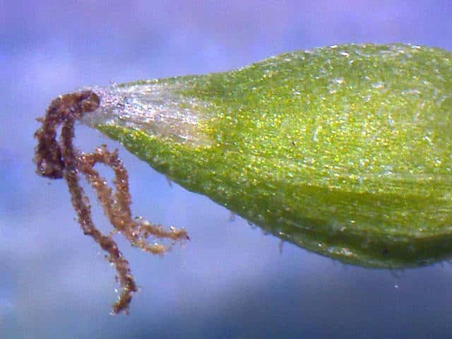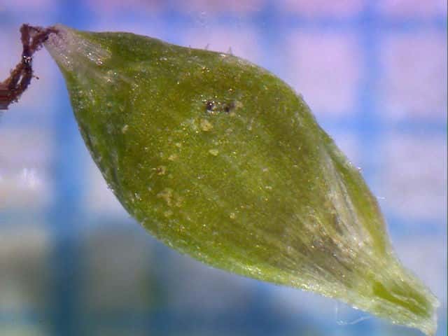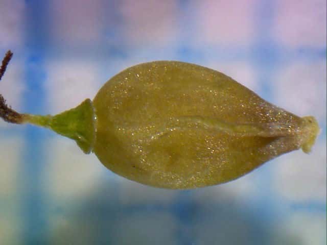 | ▼果胞にはまばらに短毛がある。 | ▼果胞の口部は2歯がある。 | ▼果実は長さ約1.5mm、付属体がつく。 |