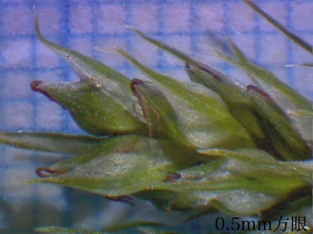 | ▼上部の苞の鞘は長さ約1.2mm。 | ▼雌鱗片は果胞より長く芒がある。 | ▼雌鱗片は長さ約3.5mm、果胞は約2.5mm。 |