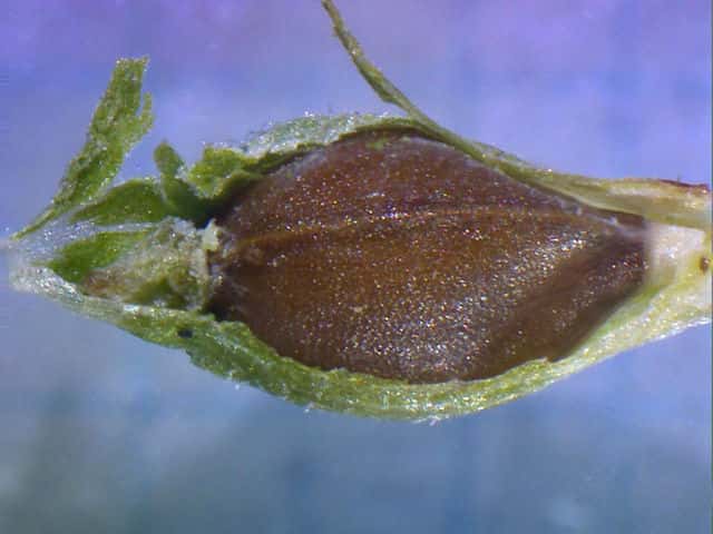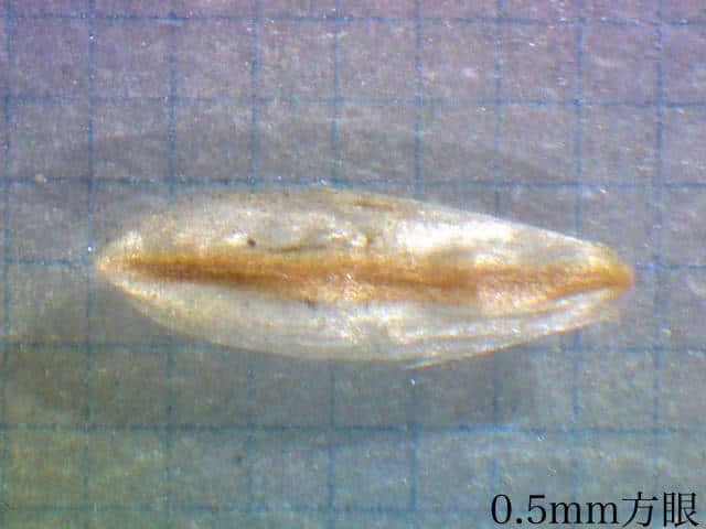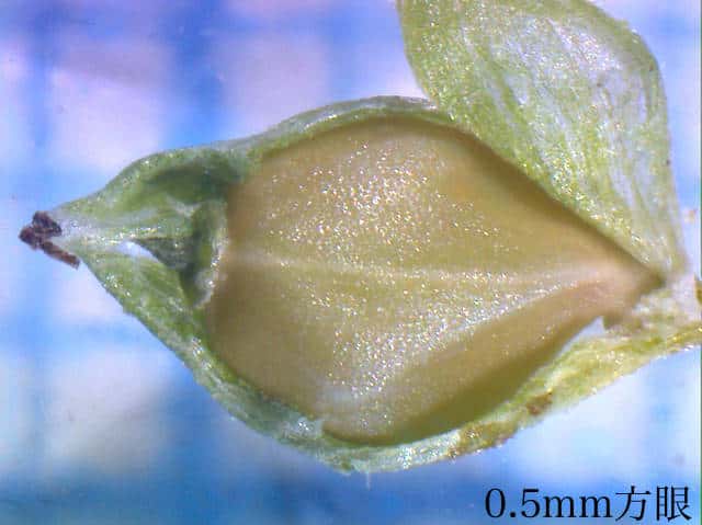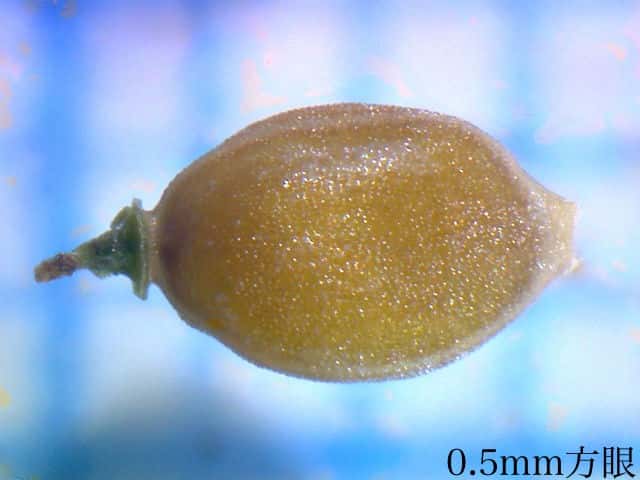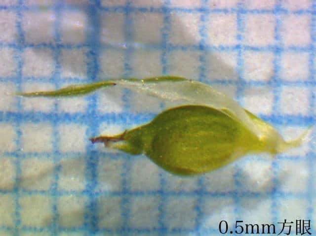 | ▼果胞の口部は2小歯がある。 | ▼果実は果胞に密に包まれる。 | ▼果実は長さ約1.5mm、盤状付属体がある。 |