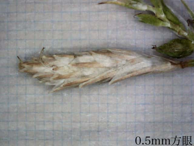 | ▼果実は果胞に密着する。 | ▼果実は長さ約1.5mm、頂に付属体が残る。 | ▼花茎は長さ約35cm。 |