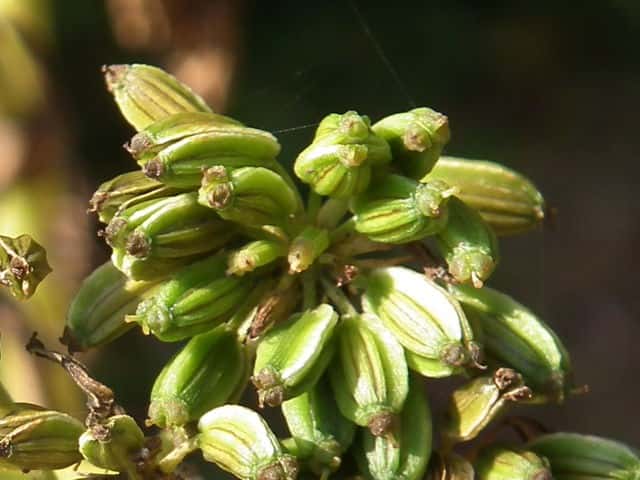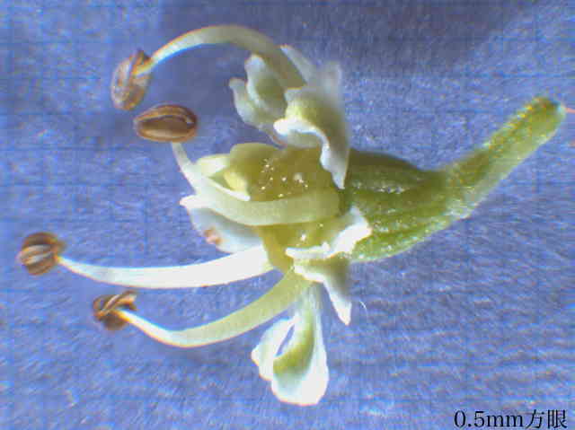 | ▼花弁や雄しべが落ちた雌性期の花。 | ▼柱頭が伸びた雌性期の花。 | ▼若い果実は長さ約6mm。 |