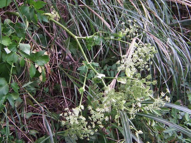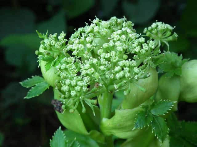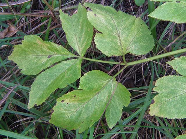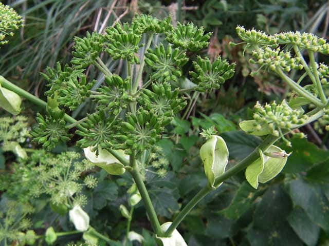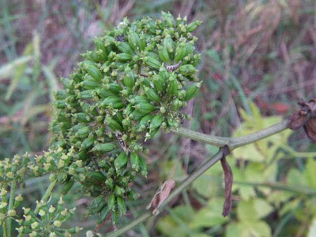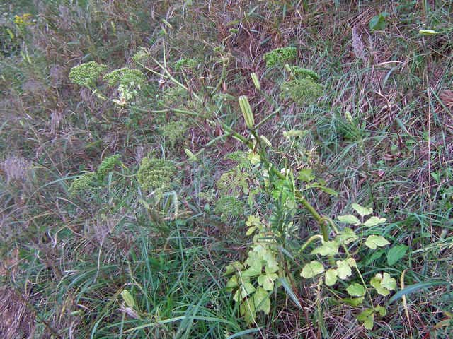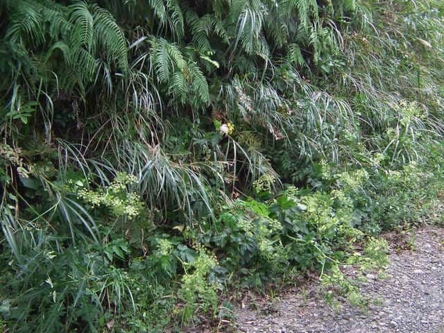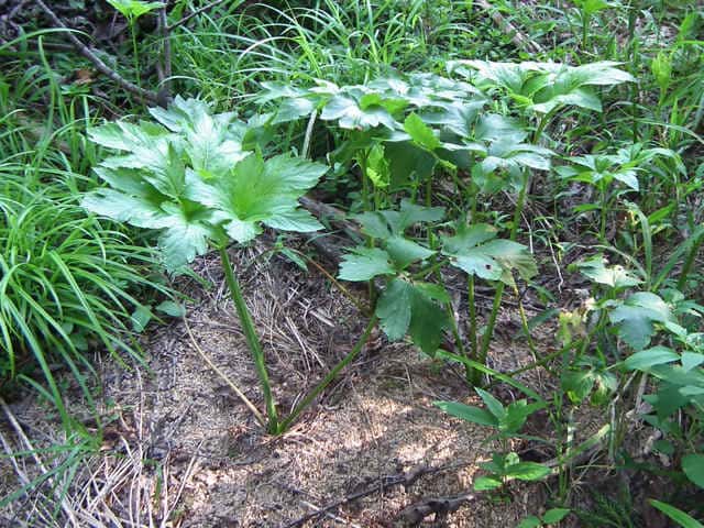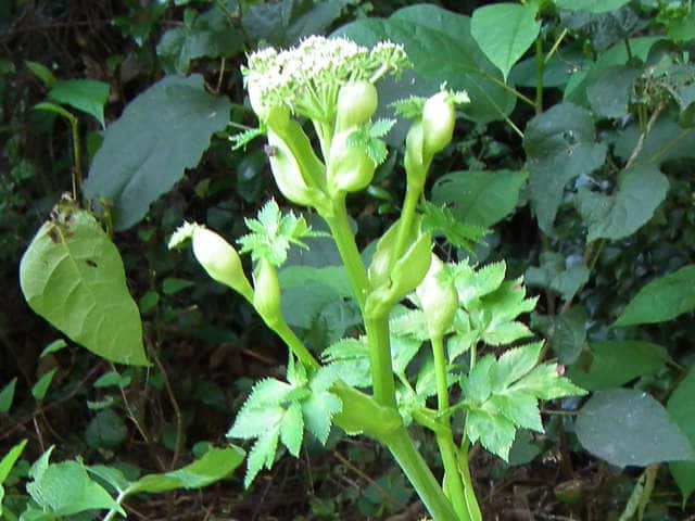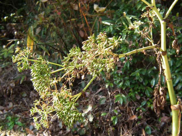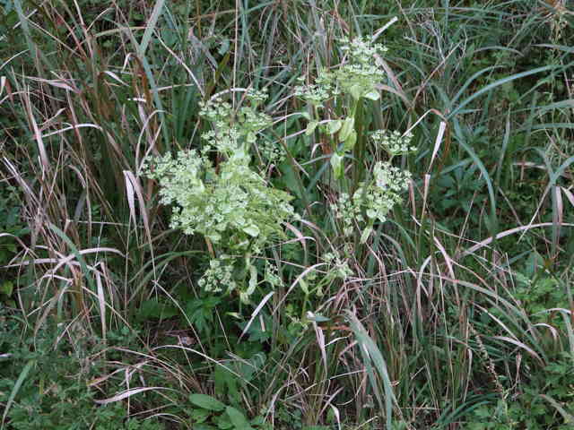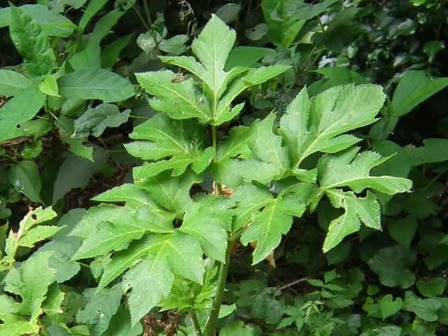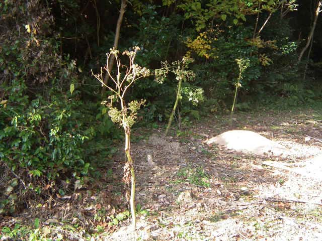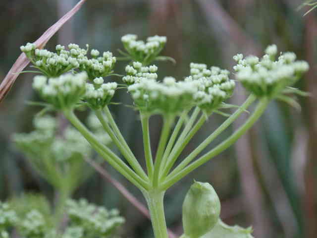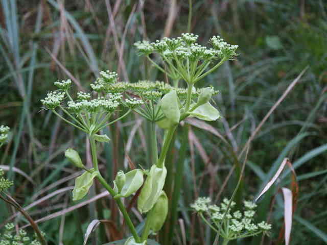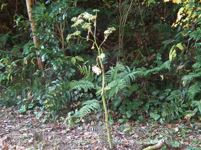 多年草 関東地方南部、東海地方、紀伊半島、伊豆諸島・小笠原の海岸に生える。茎は太くて、上部はよく枝を分け、高さ50〜120cmになる。葉は1〜2回3出羽状腹葉をなし、小葉は広卵形で、粗い鋸歯がある。葉柄の下部または全部が淡色で、袋状にふくらむ。茎や葉に濃い黄色の汁液を含む。複散形花序は総苞片がなく、小総苞片は数個ある。淡黄色の花をつけ、萼歯片はない。果実は長楕円形、分果の両翼はそれほど広くない。油管は各背溝下に1個、合生面に4個ある。分果の翼状の部分はハマウドほど広くない。花期は8〜10月。(日本の野生植物) 学名は、Angelica keiskei セリ科シシウド属 |