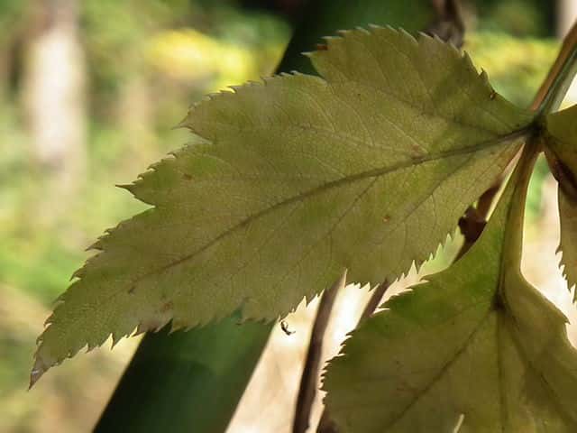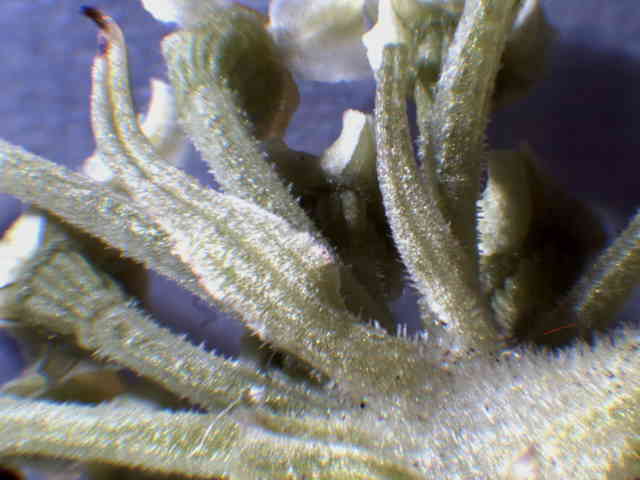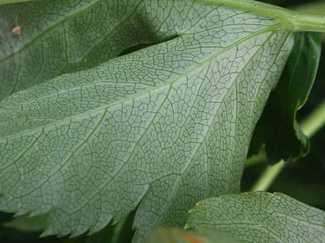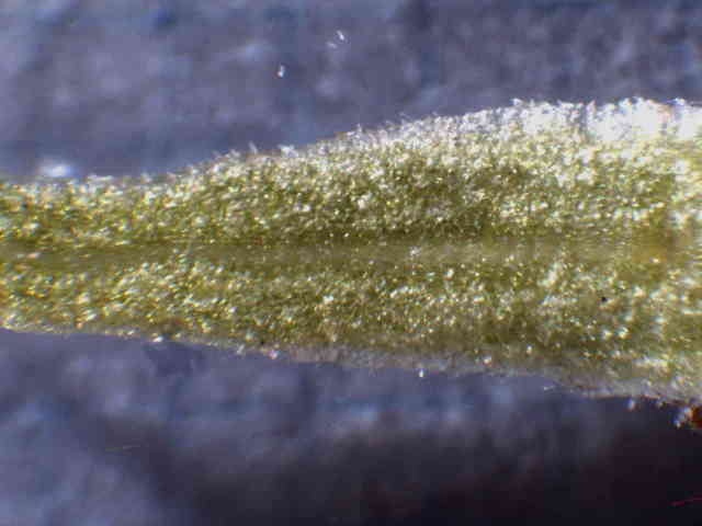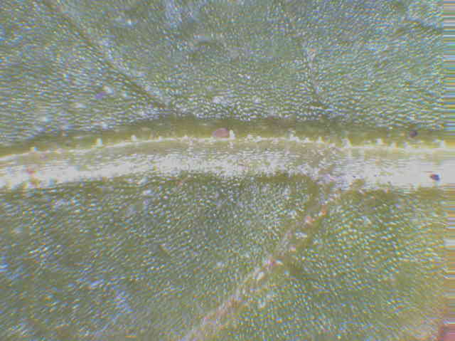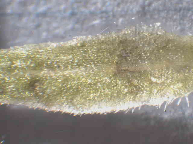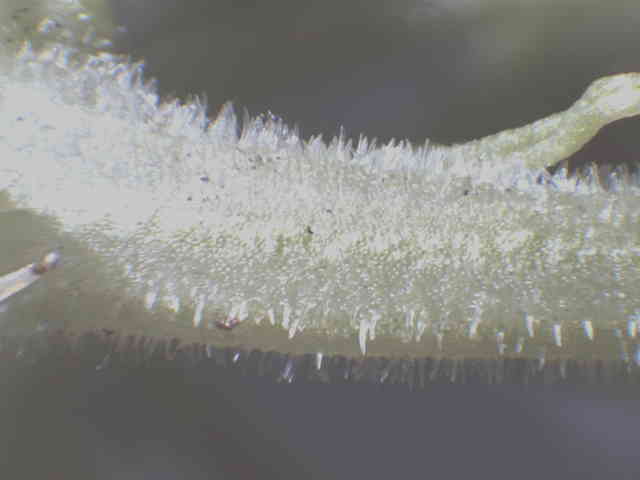 | ▼葉の表面。 | ▼葉脈状に小さな突起毛がある。 | ▼葉の裏面、白味を帯びる。 |