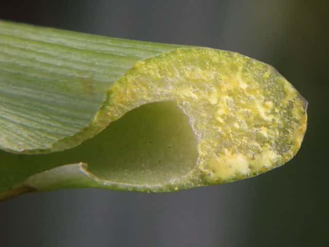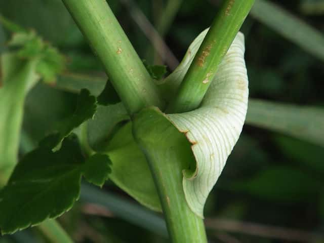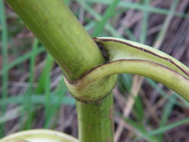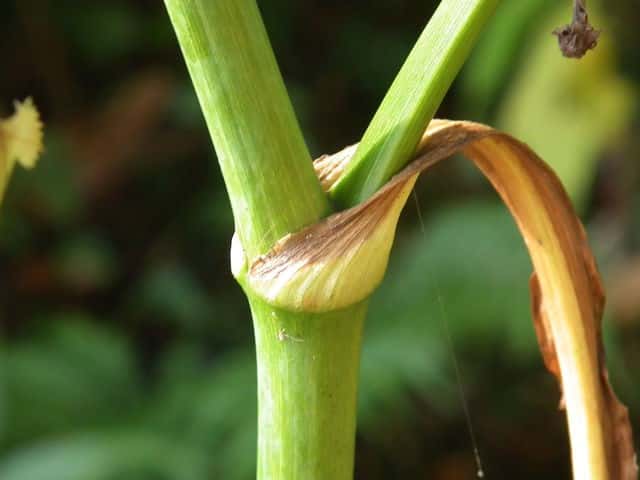 | ▼上部では葉は殆ど無くなり、大きな鞘となる。 | ||