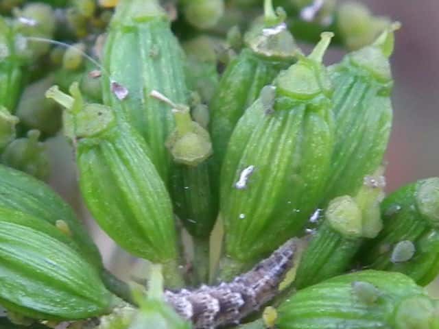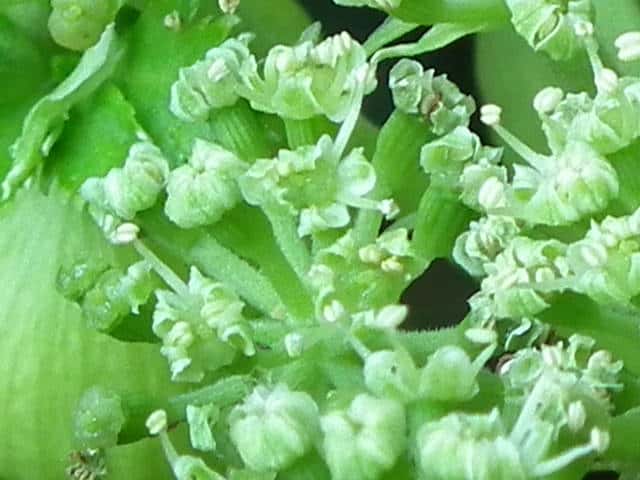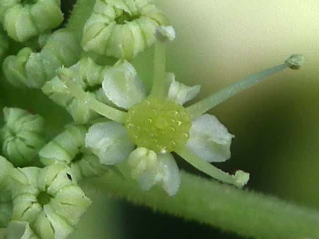 | ▼花盤に蜜が出ている雄性期の花。 | ▼花は直径約4mm。 | |
