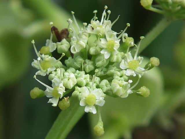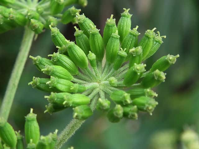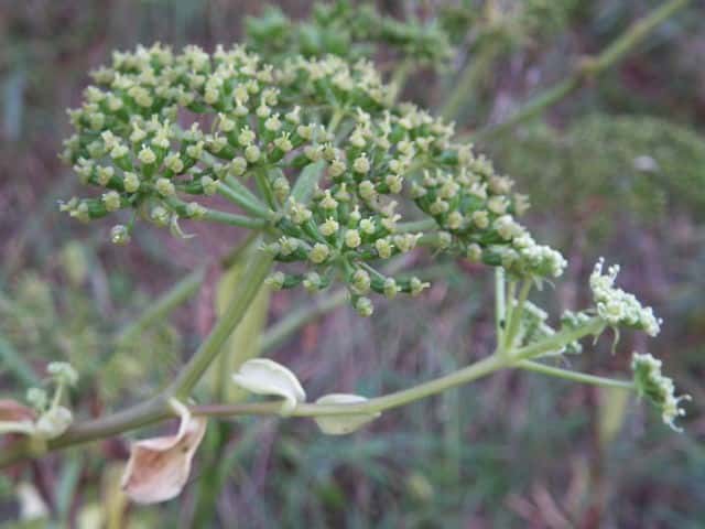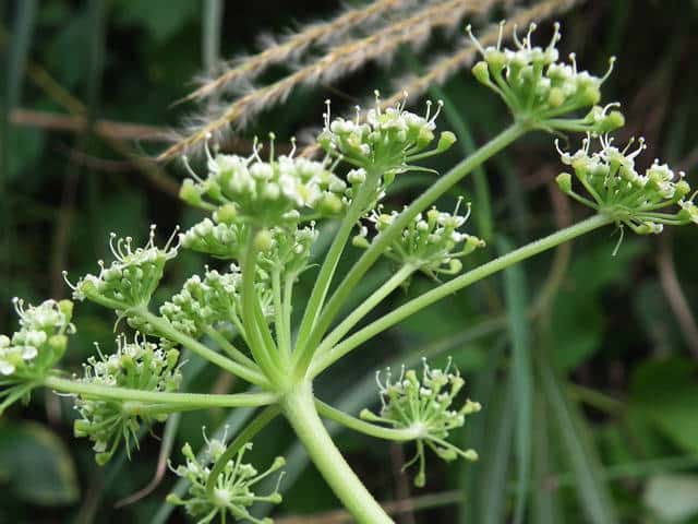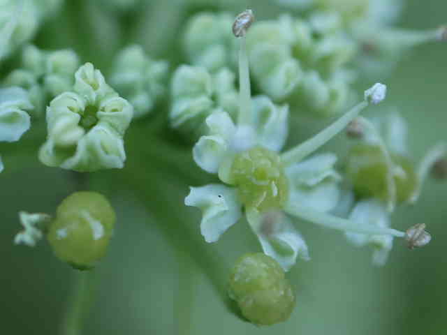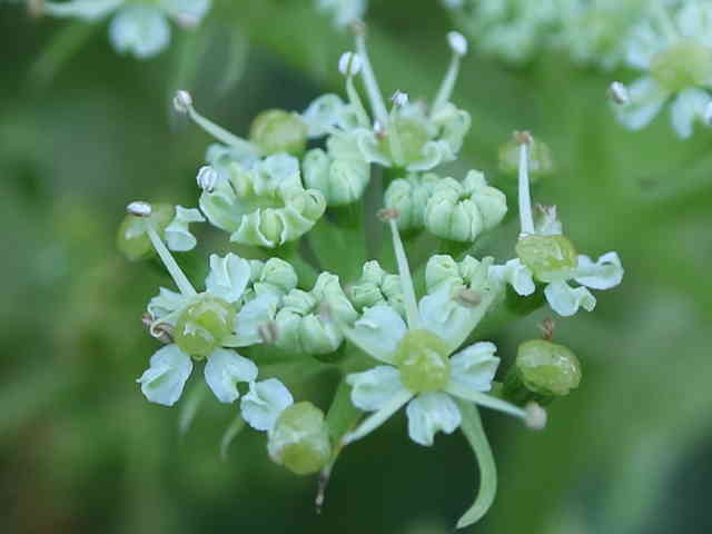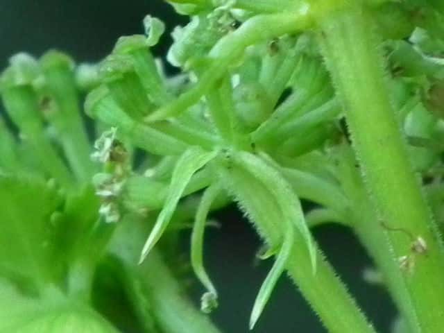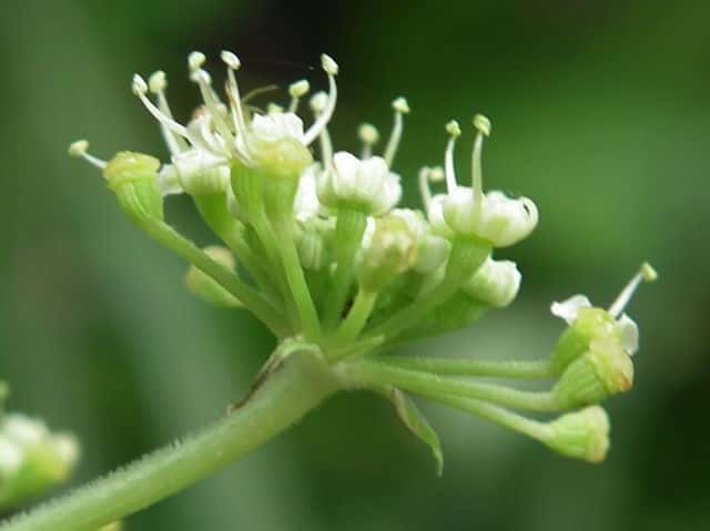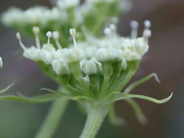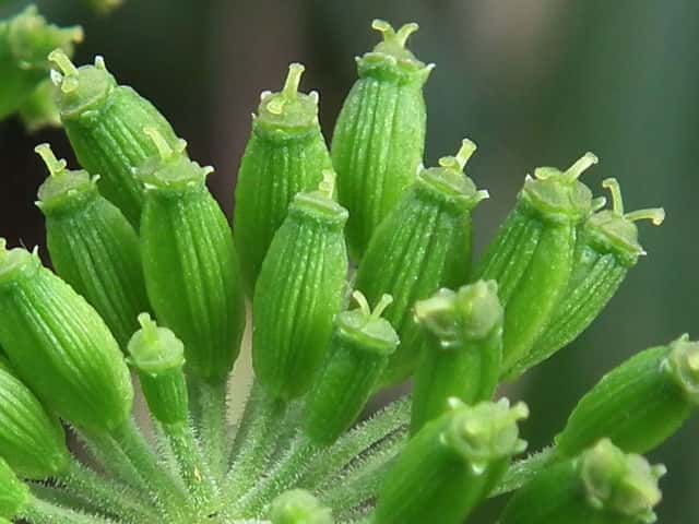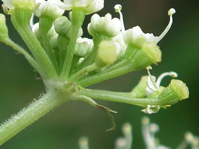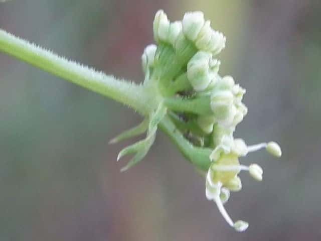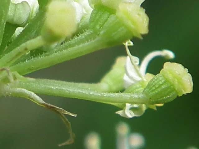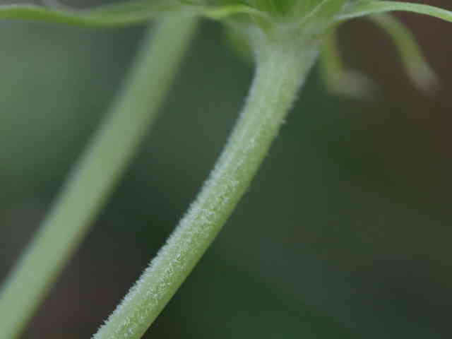 | ▼複散形花序に総苞片はない。 | ▼花序柄に毛がある。 | ▼花序柄の稜上に毛がある。 |