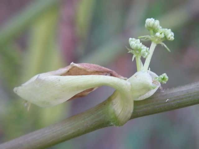 | ▼枝にも毛がある。 | ▼上部の葉は鞘だけで、葉身がない。 | ▼葉は2回3出複葉、葉柄基部は太い鞘になる。 |