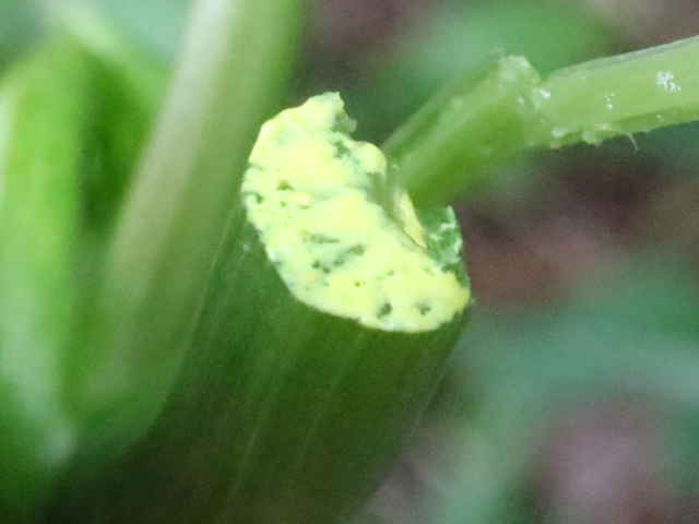 | ▼茎は無毛。 | ▼茎や葉柄を切ると黄色い汁液が出る。 | |