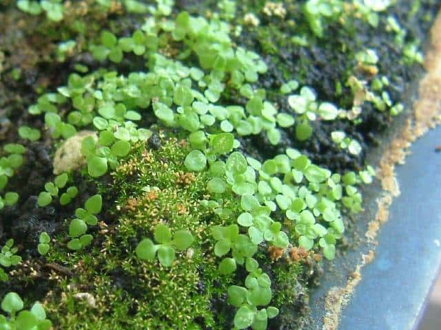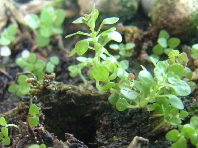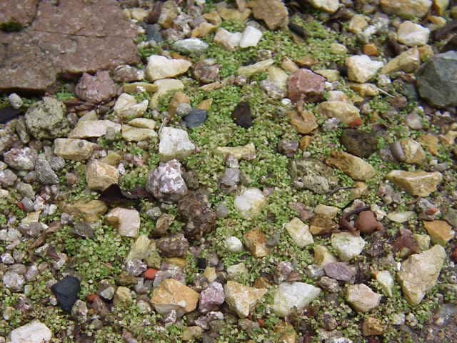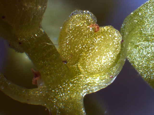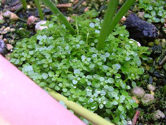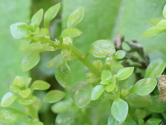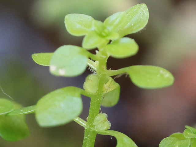 | 1年草 宮城県以西〜琉球の日陰のやや湿気の多い地面に生える。茎は下部で分枝して四方に広がり、長さ1〜4cm、ところどころから根を出して地面をおおう。葉は対生し無毛、倒卵形または倒卵状円形、先は鈍いか、短くとがり、基部はしだいに狭くなって柄となり、柄とともに長さ2〜5mm、幅1〜3mm、軟質で3(〜5)本の脈がほぼ平行に走り、全縁。葉腋ごとに1花をつける。雄花は小さな膜質の2枚の苞の中に1本の雄しべがあり、雄しべは長さ0.5mm、葯は黄色をおびる。雌花は小さな膜質の2枚の苞に包まれて1個の雌しべがあり、花柱は長さ約0.3mm。花柱は基部まで2裂し、線形。果実は円状心形で先端はへこみ、長さ約1mm、幅0.8mm、縁に4翼がある。果実は4個の分果に分かれ、各分果の背面に翼がある。花期は5〜6月。(日本の野生植物) 学名は、Callitriche japonica オオバコ科アワゴケ属 似たものに帰化植物のアメリカアワゴケがあり、果実に明らかな柄があり、翼はないということです。 |