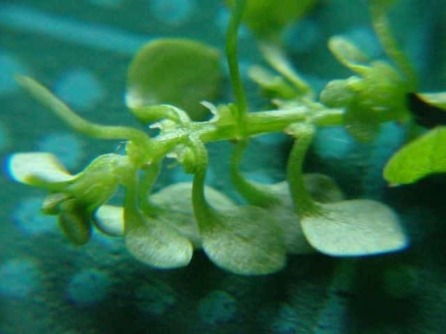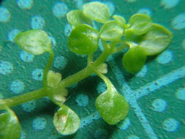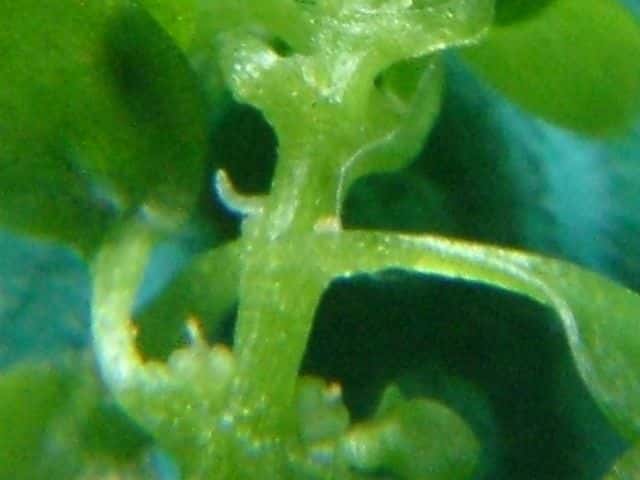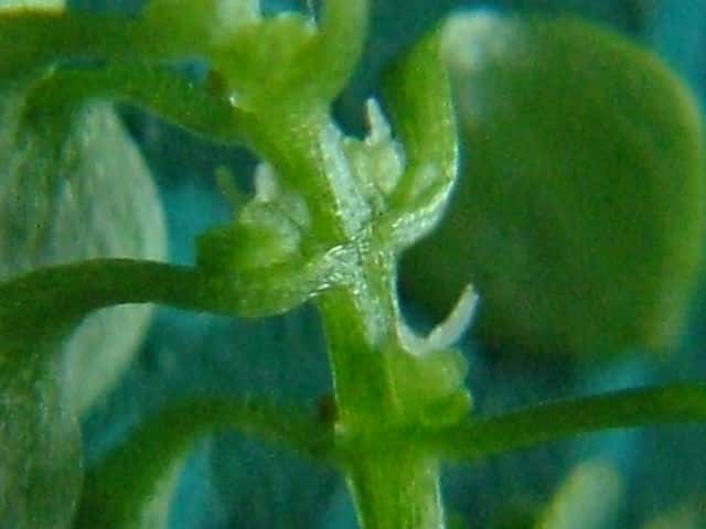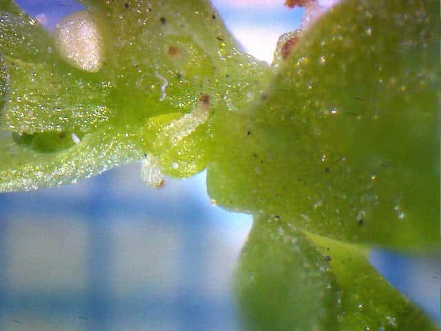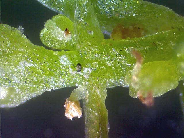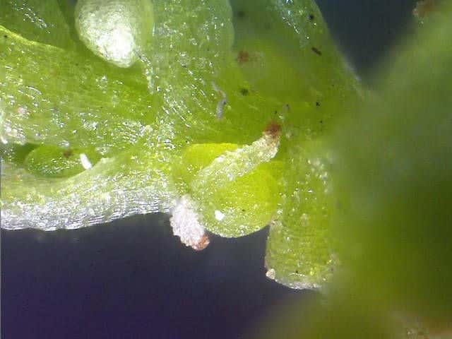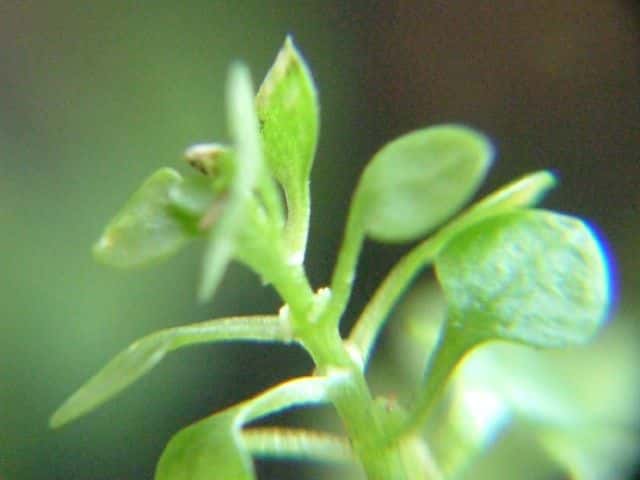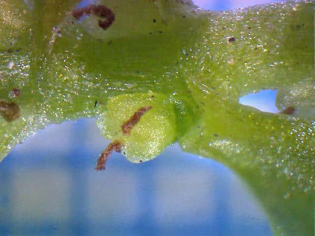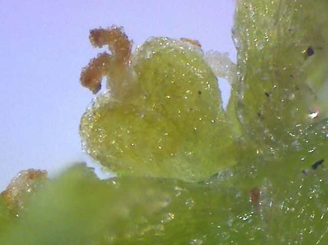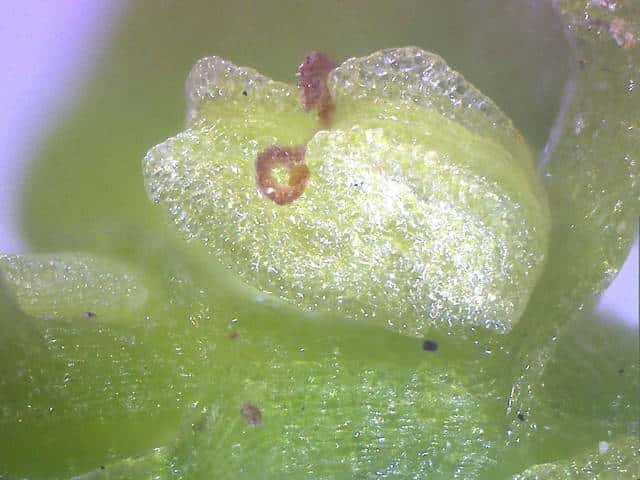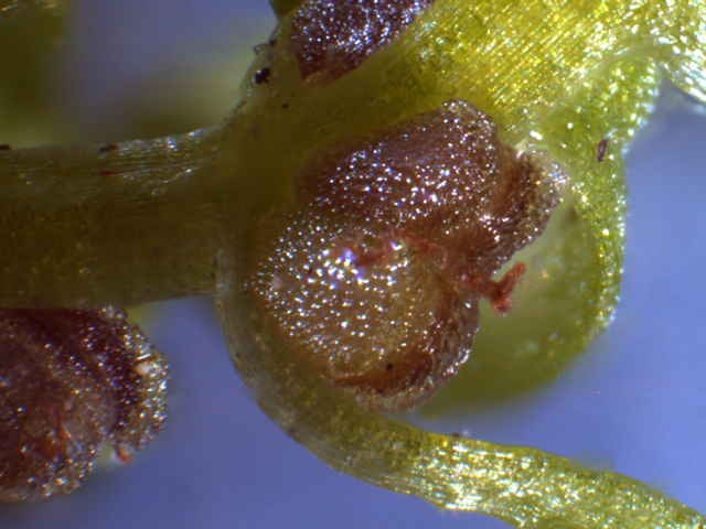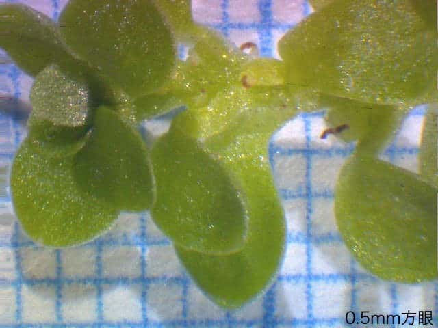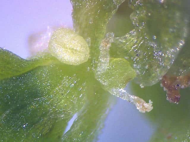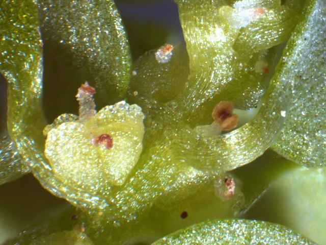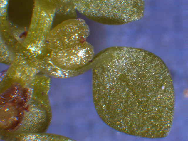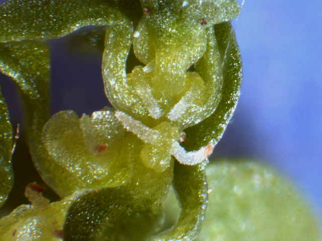 | ▼雄花は、長さ約0.4mmの雄しべ1個。 | ▼雌花(上)と雄花(下)雄花。 | |