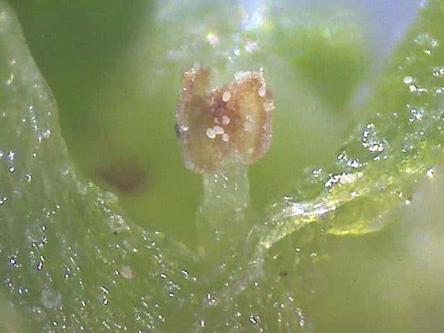 | ▼雄花、雄しべ1個だけ。 | ▼葯が開いて花粉が出ている。 | |