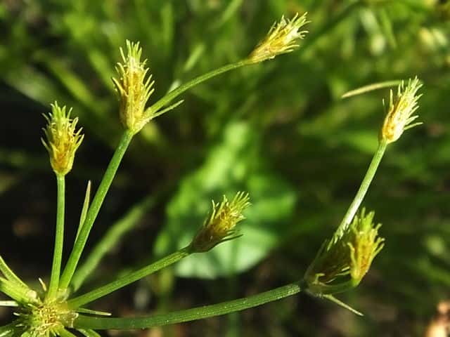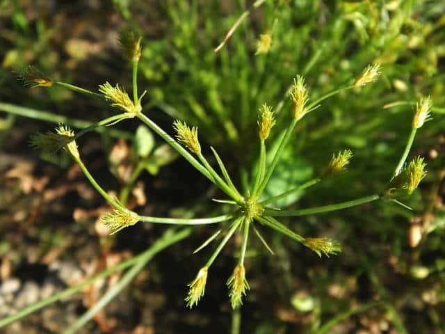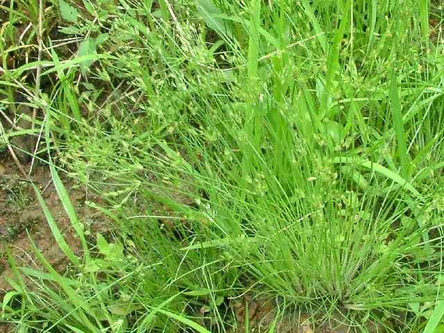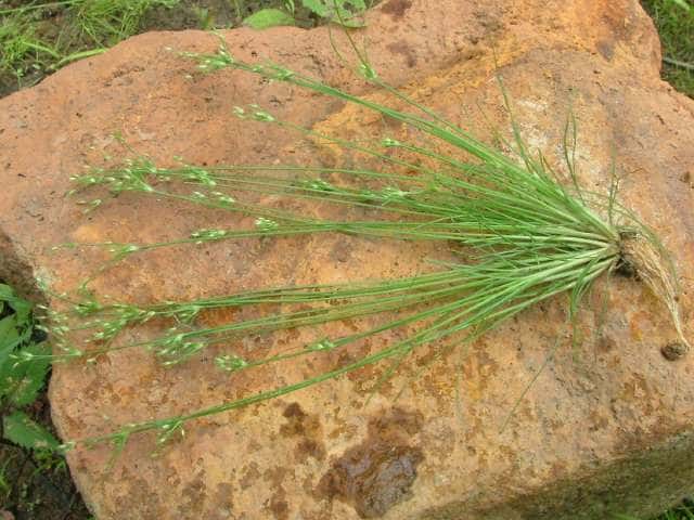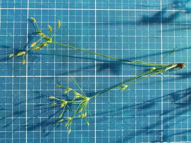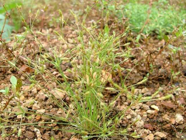 | 1年草 北海道〜沖縄の田のあぜ、休耕田などに生える。叢生する。高さ10〜20cm。葉は柔らかく糸状。花序枝は1〜2回分岐する。苞葉は花序より短い。小穂は多数つき、披針形、鱗片には熟すと外に曲がる長い芒がある。果実は0.7mm、倒卵形で平滑、横断面はレンズ形。花柱は短毛が生え、柱基に長毛がある。柱頭は2岐。果期は7〜9月。(カヤツリグサ科入門図鑑) 学名は、Fimbristylis squarrosa カヤツリグサ科テンツキ属 よく似たメアゼテンツキの鱗片の先は短い芒状になる。またコアゼテンツキは花柱の基部に毛がない。 |