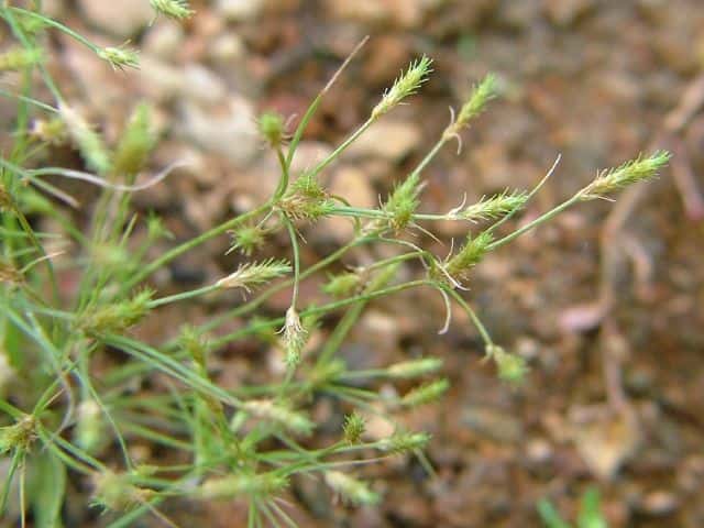 | ▼小穂は長さ5〜6mm。 | ▼雌鱗片の長い芒は反曲する。 | ▼雌鱗片は長さ2.5mm。 |