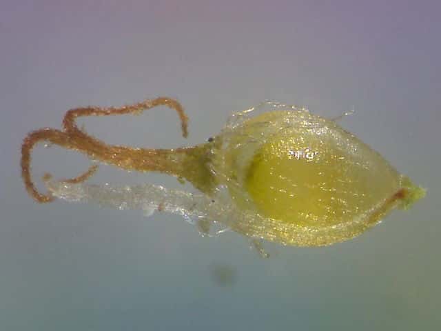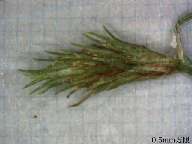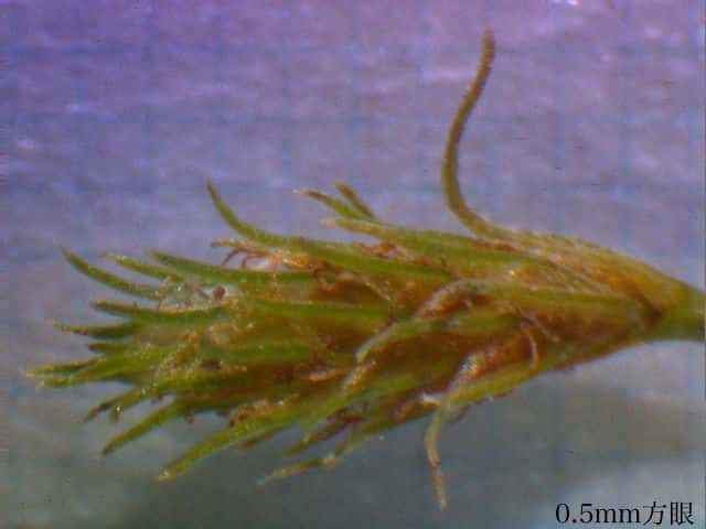 | ▼雌鱗片には長い芒がある。 | ▼雌鱗片の芒は長さ約1mm。 | ▼柱頭は2岐、果実は長さ約0.6mm。 |