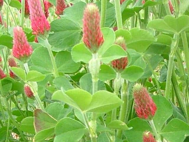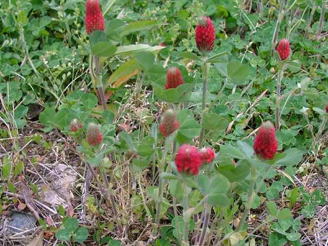 | 1年草 ヨーロッパ〜西アジアにかけての原産。明治の初期にクリムソンクローバーの名で牧草として導入されたが、あまり普及しなかった。近年、花卉としても栽培され、ここからも逸出して、市街地などで見られる。全体に白い軟毛を布き、茎は下部でよく分岐して斜上し、長さ80cmほどになる。葉は下部のものには長い柄があって互生し、基部には筒状の托葉がある。小葉は3枚で、心臓形で先端が凹み、上部に鋸歯がある。茎の先端に直径2cmほどの円柱形の花穂を出し、濃赤色の小型の蝶形花を密につける。花期は春〜夏。(日本帰化植物写真図鑑) 学名は、Trifolium incarnatum マメ科シャジクソウ属 |