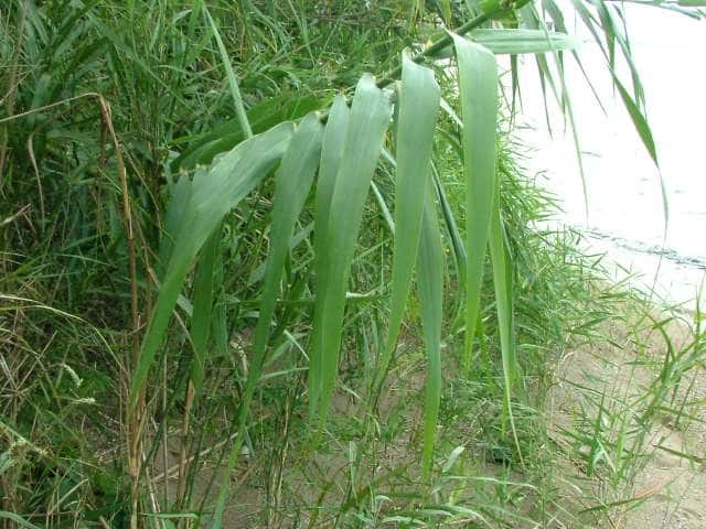 | 多年草 関東以西〜沖縄の暖地の海岸に生育し、大形で群生する。根茎は太く短い。茎の高さ2〜4m、径2〜4cm、中空、平滑。葉は長さ30〜60cm、幅2〜5cm。粉白色を帯び両面はざらつくが無毛。葉舌は長さ1〜2.5mm、縁に毛がある。葉鞘は無毛。花序は長さ40〜60cm、淡緑色に多少赤紫色を帯び光沢があり、密に枝を出して多数の小穂をつける。小穂は長さ10〜12mm、2〜5小花からなる。2個の包穎は披針形、3脈あり先端はとがる。護穎は披針形、3〜5脈、長さ7〜8mm、先端に2歯があり、歯間から長さ2〜3mmの直立する芒を出し、基盤に短毛が叢生し、内穎は護穎より短い。花期は9〜10月。(日本イネ科植物図譜) 学名は、Arundo donax イネ科ダンチク属 |