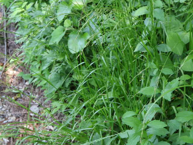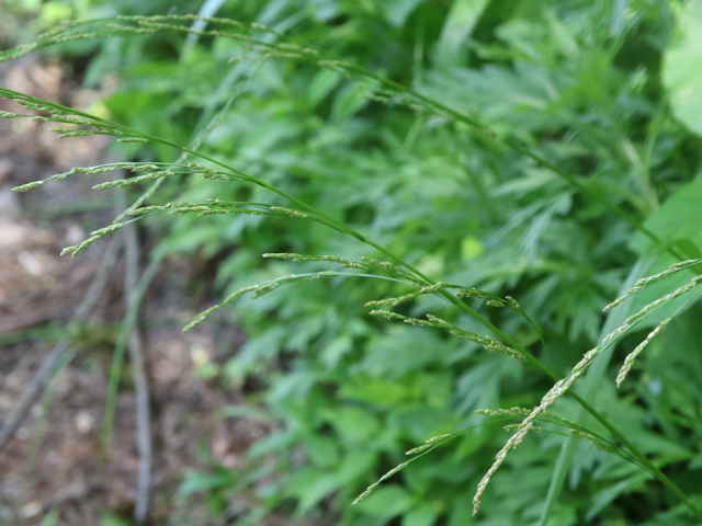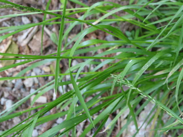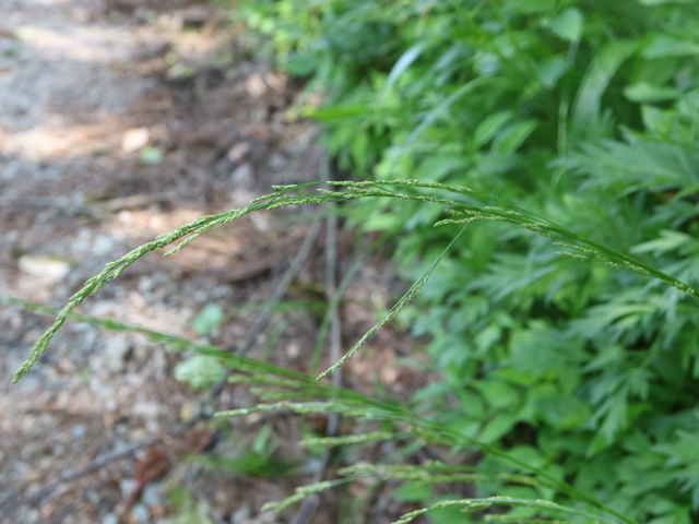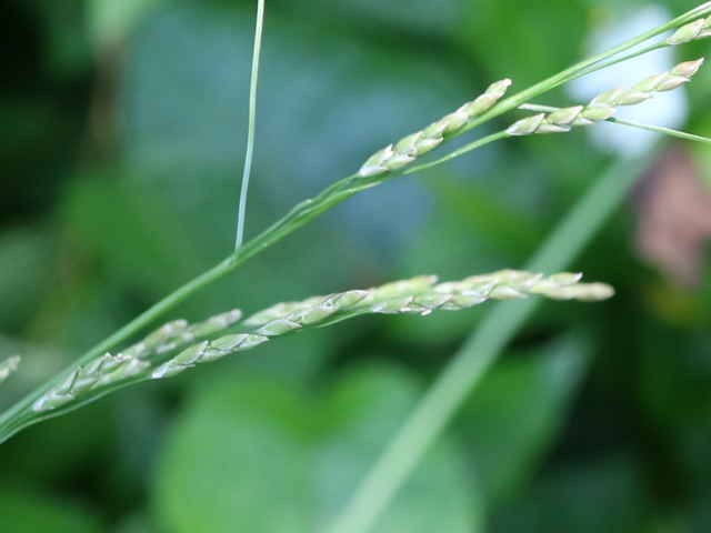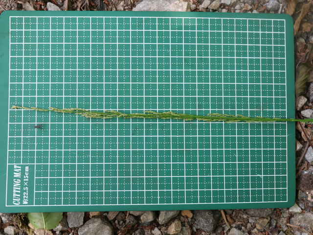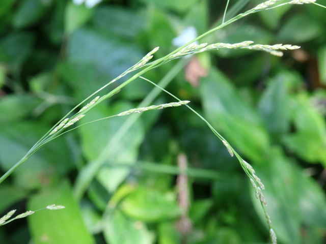 | 多年草 北海道〜沖縄の低地の湿地や水田のあぜなどに生育し、散生またはやや群生する。茎の基部は短く屈曲し、上部は斜上し、平滑・無毛、葉は平滑・無毛、葉舌は膜質・切形、長さ1〜1.5mm。葉鞘は完全な筒形、上縁に耳状の突起があり、平滑・無毛。花序は長さ20〜30cm、各節より2〜3本の細い枝を出し小穂を着ける。小穂は狭長、長さ9〜12mm、5〜9小花からなる。第1苞穎は長さ1.5mm、第2苞穎は2mm。小花は長さ2.5mm。果実は楕円形、腹面はくぼみ、光沢があり茶褐色、長さ1〜1.4mm。花期は5〜6月。(日本イネ科植物図譜) 学名は、Glyceria ischyroneura イネ科ドジョウツナギ属 |