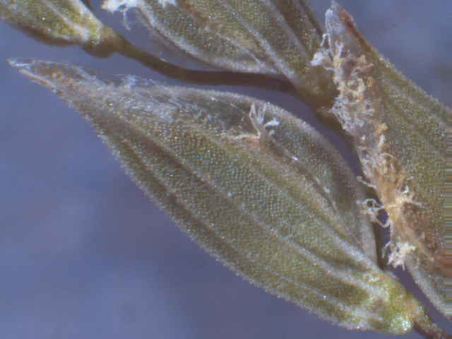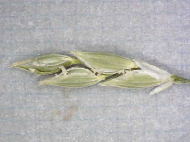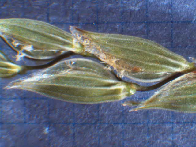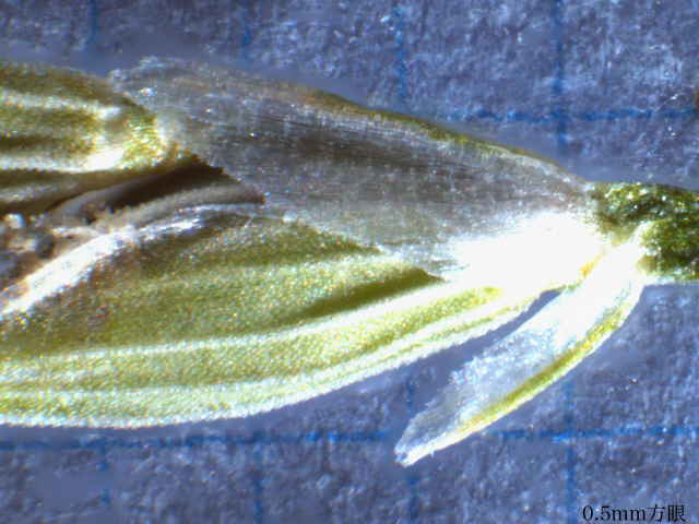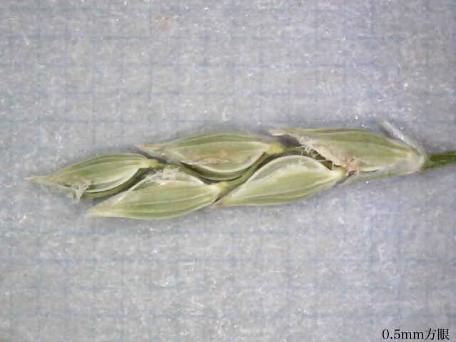 | ▼5小花の小穂は長さ約7mm。 | ▼第1苞穎は長さ約1mm、第2苞穎は1.8mm。 | |