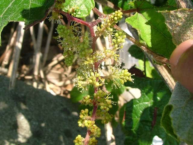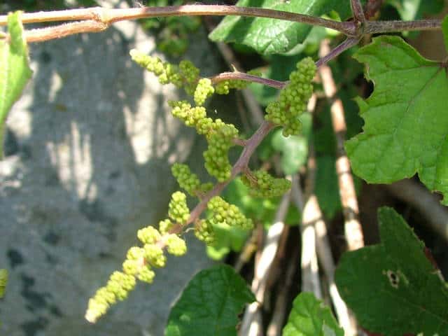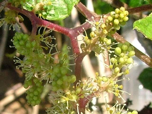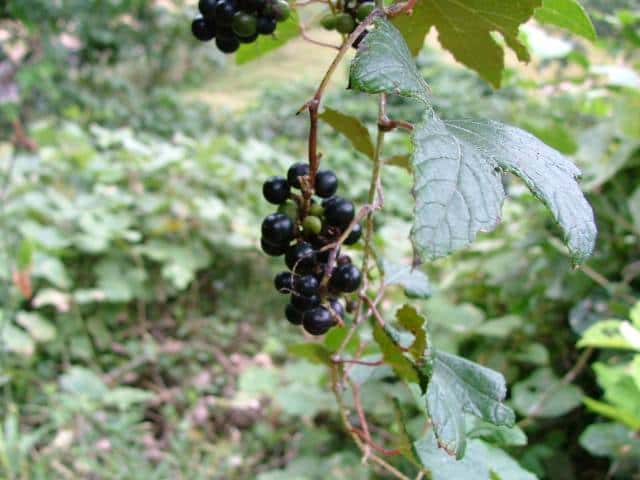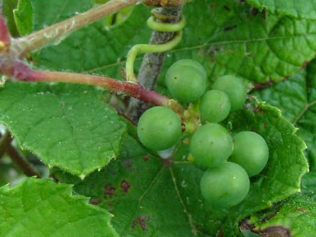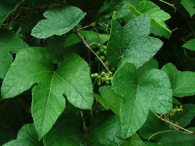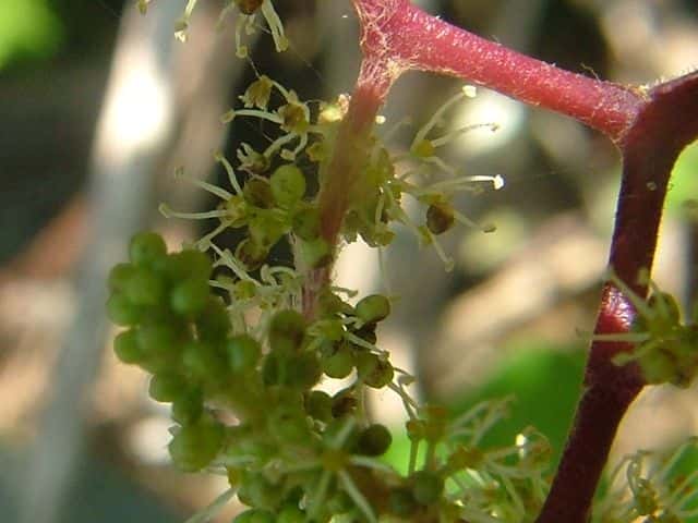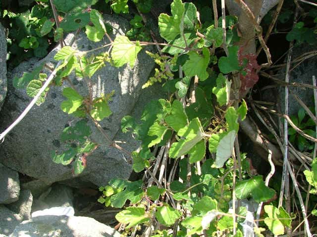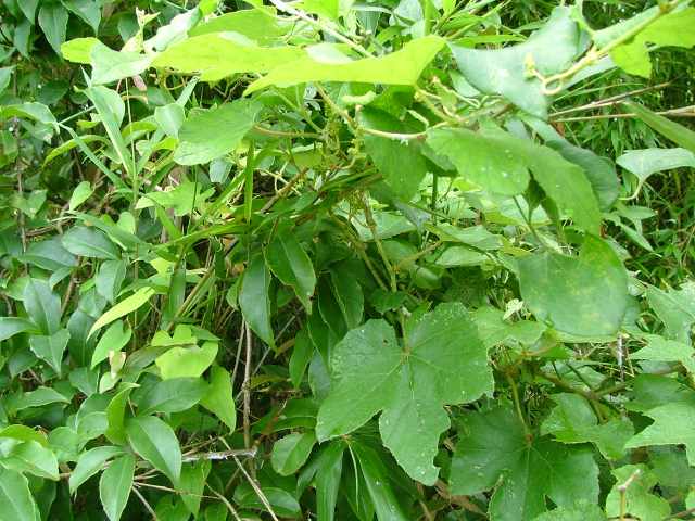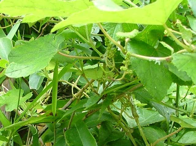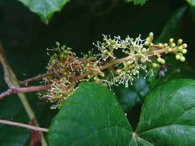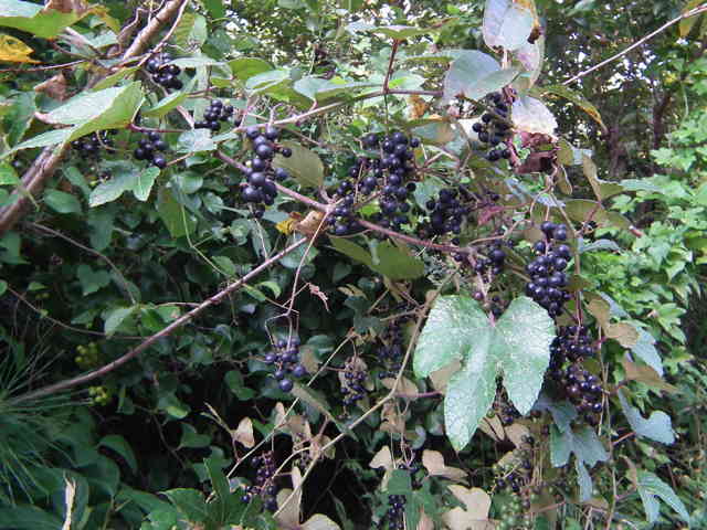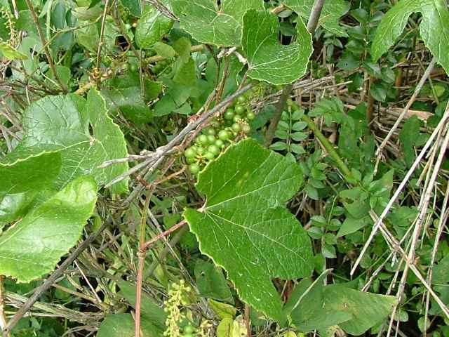 | 落葉つる性木本 本州〜沖縄の丘陵から山地の林内や林縁に生える。巻ひげで他物にからみつく。本年枝は細く、はじめクモ毛がある。葉は互生。葉身は長さ幅ともに5〜8cmの卵形〜広卵状三角形。ふつう3〜5裂するが、切れ込み方は変化が多い。縁には浅い鋸歯がある。基部は深いハート形。表面ははじめクモ毛があるが、後に無毛。裏面は淡褐色または白色のクモ毛に覆われ、秋まで残る。葉柄は長さ2.5〜8cm。雌雄別株。葉と対生して長さ6〜12cmの円錐花序を出し、黄緑色の小さな花をつける。花弁は開花と同時に落ちる。両性花の花序は雄花序より小形で花はまばらにつく。雄花の雄しべは長く、両性花の雄しべは短い。果実は液果。直径約6mmほどの球形で、黒く熟す。種子は暗赤褐色で長さ4mmほど。花期は6〜8月。(樹に咲く花) 学名は、Vitis ficifolia ブドウ科ブドウ属 葉の切れ込みの深いものをキクバエビヅル(Vitis ficifolia f. sinuata)といい、西日本に多い。 |