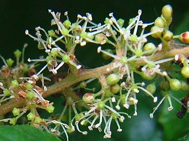 | ▼2005年7月17日 雌花(両性花)雌株 八雲森脇 花弁は早く落ちる。雌しべの柱頭と雄しべがある。 | ||