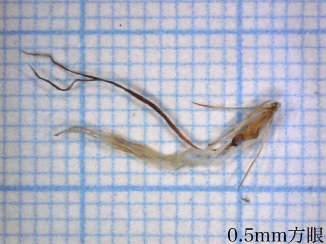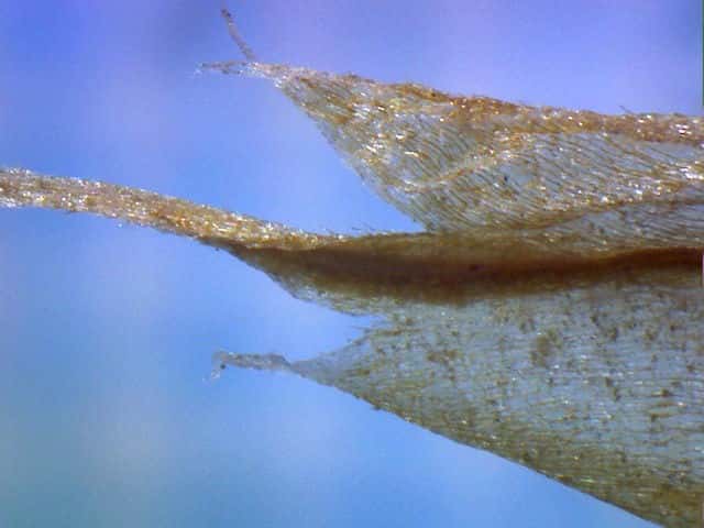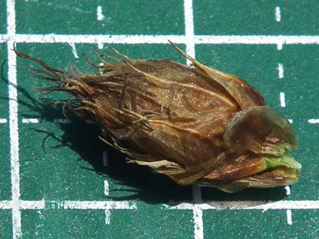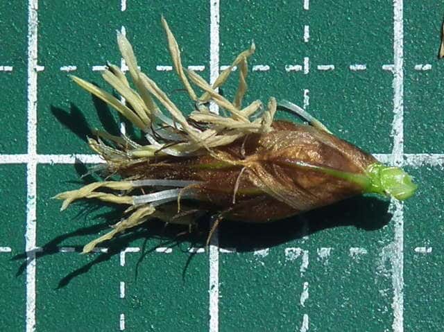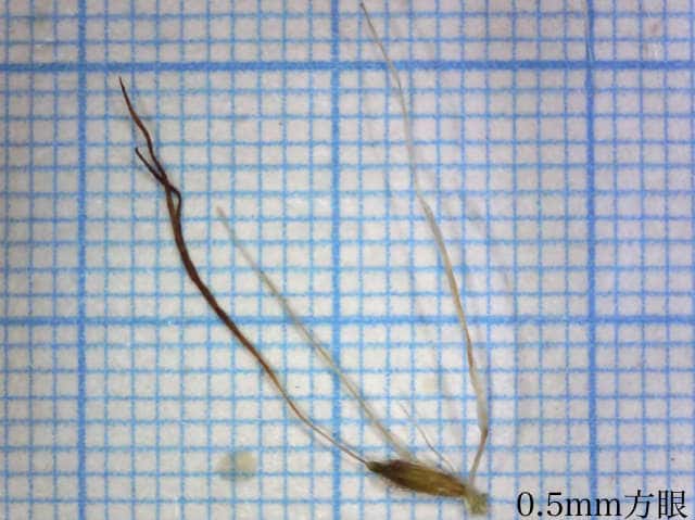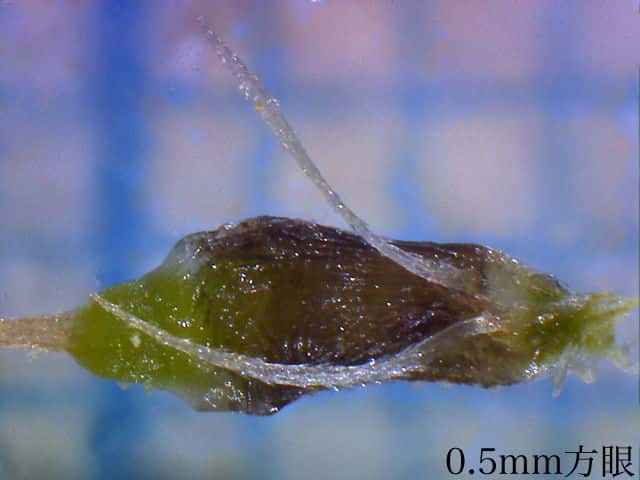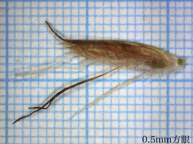 | ▼小穂は長さ約15mm。 | ▼鱗片は長さ約7.5mm、先端は芒となる。 | ▼表面に細毛がある。 |