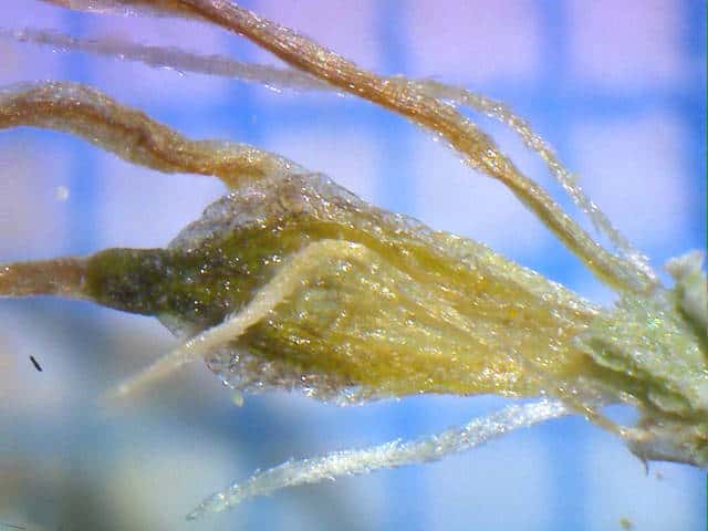 | ▼表面の細毛。 | ▼柱頭は2裂する。 | ▼未熟な果実、刺針状花被片が2個ある。 |