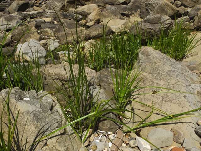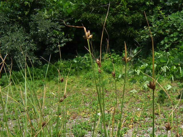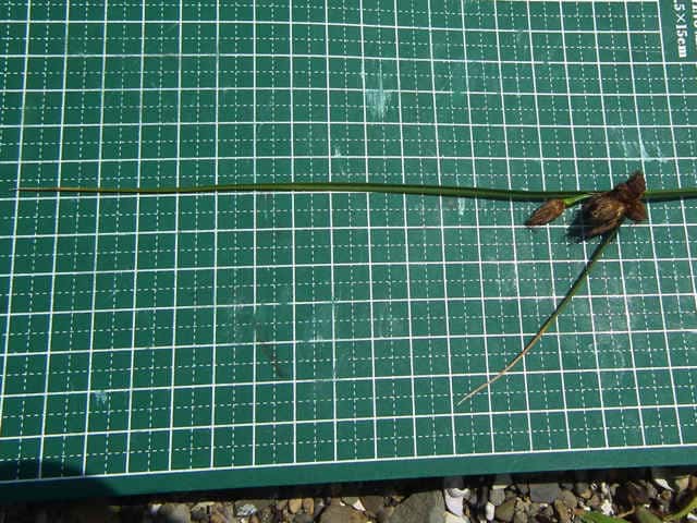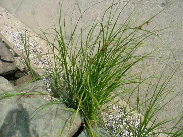 | 多年草 北海道〜九州の海岸の湿地に生える。匍匐根茎があり、先端に塊茎を生じる。稈は高さ40〜100cm、横断面は3稜形、基部は少し肥厚する。葉は幅2〜5mm。花序は1〜6個の小穂をつけ、頭状となる。苞葉の葉身は葉状で1〜3枚が花序より長い。小穂は卵形、長さ8〜15mm、光沢のある赤褐色。鱗片は膜質、長さ7〜9mm、楕円形、細毛があり、凹頭、中肋は細く先は突出し、少し反曲する長さ1〜2mmの芒となる。そう果は長さ3.5〜4mm、広倒卵形、黄褐色、横断面は平凸レンズ形で中央部が少しくぼむ。刺針状花被片は2〜4本、脱落しやすく、長さはそう果の約1/2、下向きにざらつく。柱頭は2個、まれに3個。別名エゾウキヤガラ。花期は7〜10月。(岡山県カヤツリグサ科植物図譜) 花序は1〜6個の小穂をつけ、頭状となり、ときに複生して1〜2本の花序枝の先に小穂が単生する。(西宮の湿性・水性植物) 学名は、Bolboschoenus koshevnikovii カヤツリグサ科ウキヤガラ属 よく似たウキヤガラは、花序は散形、花序枝は長さ7cmに達し、先端に1~6個の小穂をつける。(西宮の湿性・水性植物) |