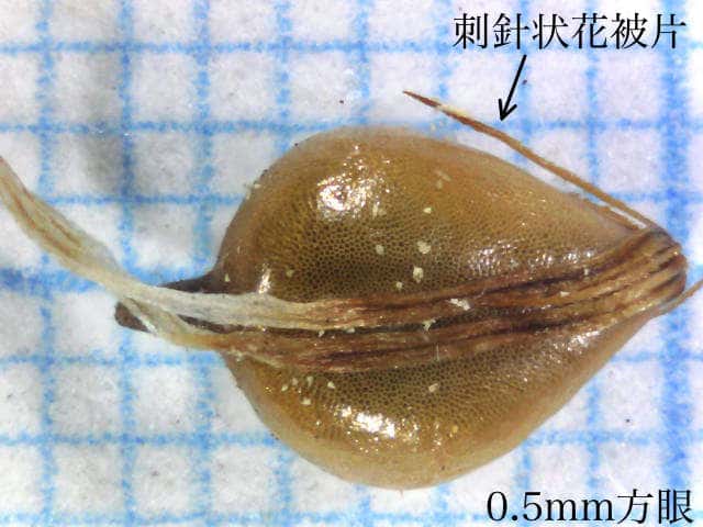 | ▼刺針状花被片は果実のほぼ半長。 | ▼果実の中央部がやや凹む。 | |