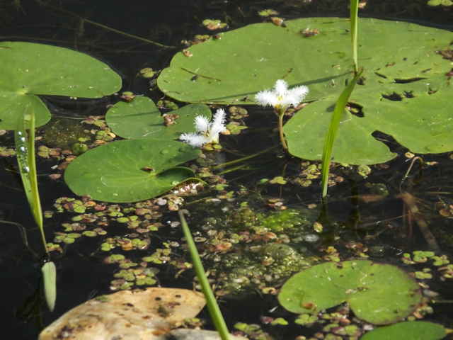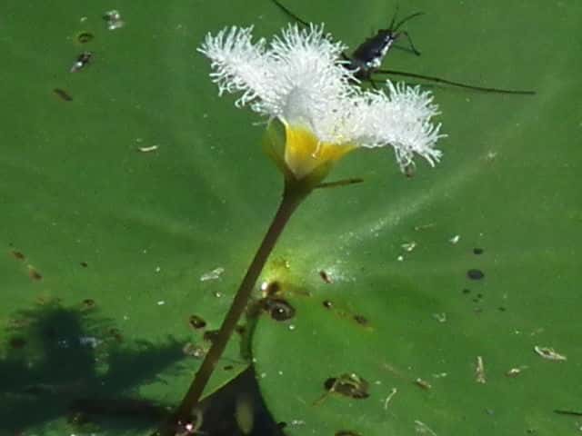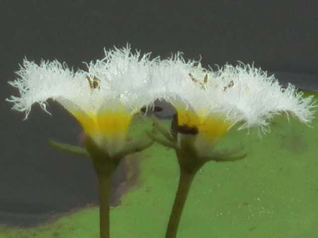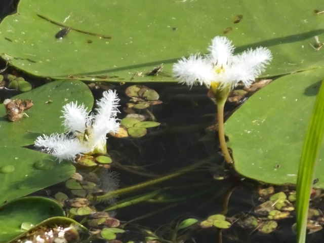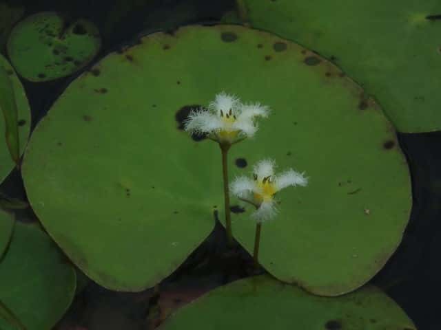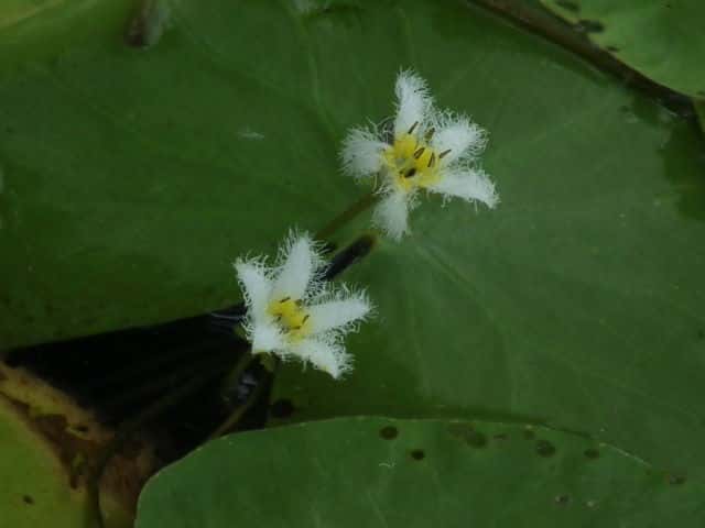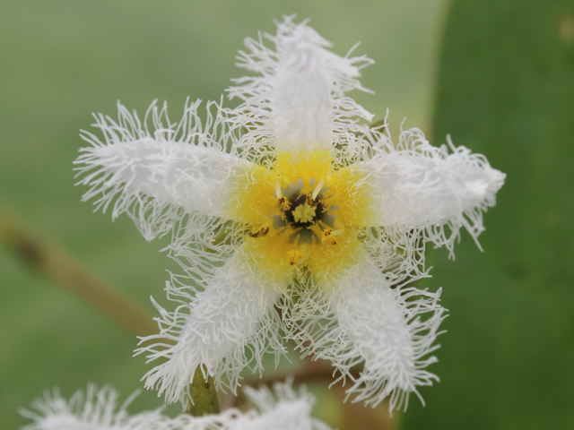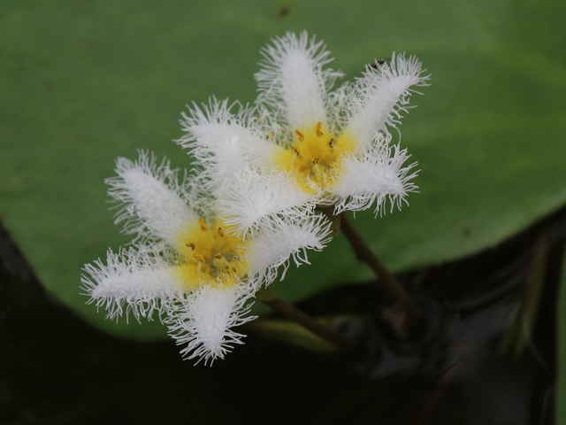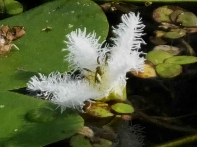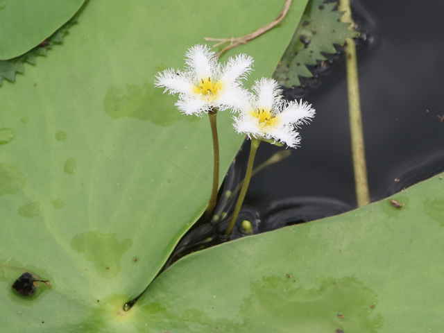 | 多年草 本州〜九州の湖沼やため池などに群生する。茎は細くて長く、1〜3個の葉をつける。葉身は広楕円形または卵状円形で径4〜20cm、基部は深い心形、全縁、裏面は紫色、微小な腺点がある。葉柄は長さ1〜2cmで、基部はやや耳状になり花序の基部を抱く。花は葉柄の基部に数個〜多数束生する。花柄は長さ3〜10cm、萼裂片は卵形で長さ4〜6mm。花冠は白色で、径約15mm、裂片の内面と縁に長い毛が密生する。株により長花柱花と短花柱花がある。さく果は楕円形で長さ4〜5mm。種子は広楕円形で光沢があり、長さ0.8mm。花期は7〜9月。(日本の野生植物) 学名は、Nymphoides indica ミツガシワ科アサザ属 よく似たヒメシロアサザは花の縁にだけ白毛がある。 |