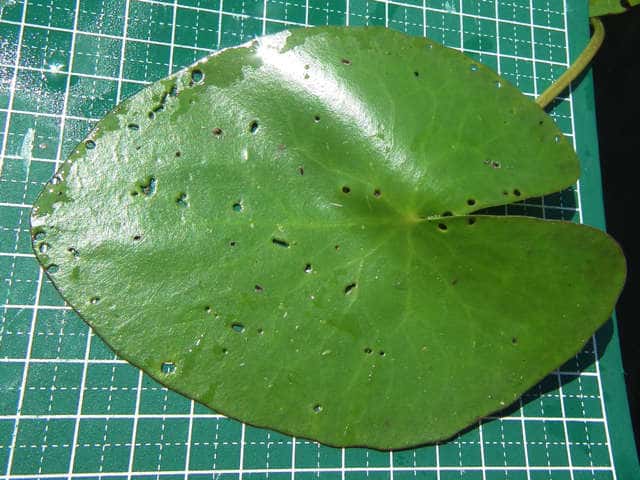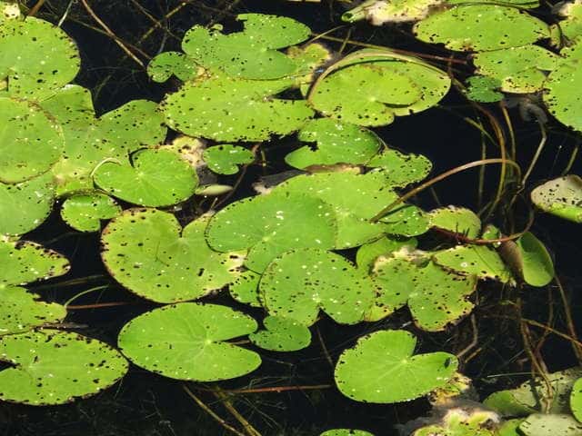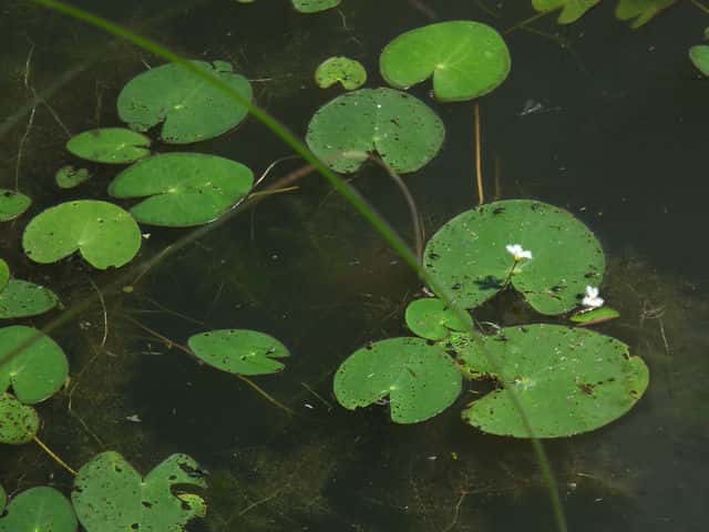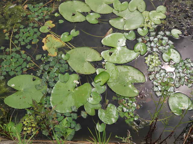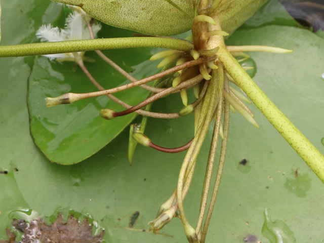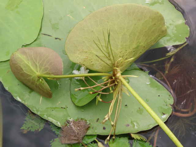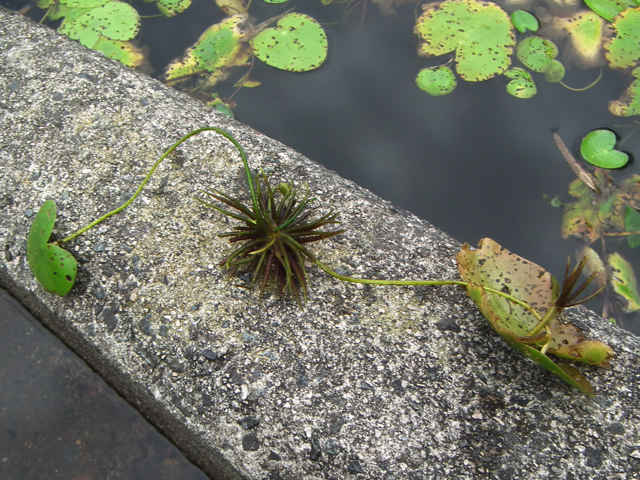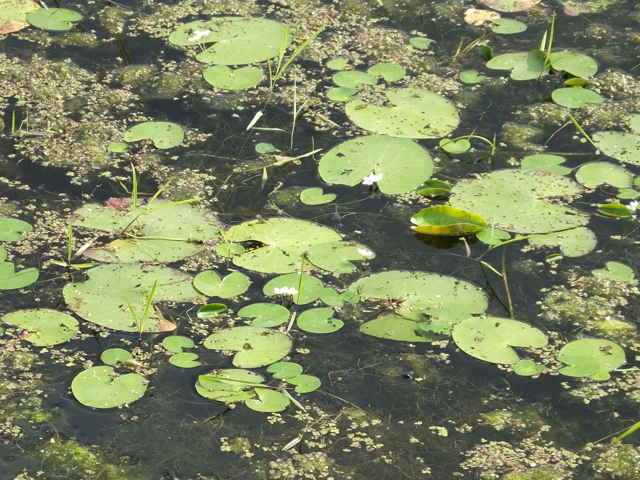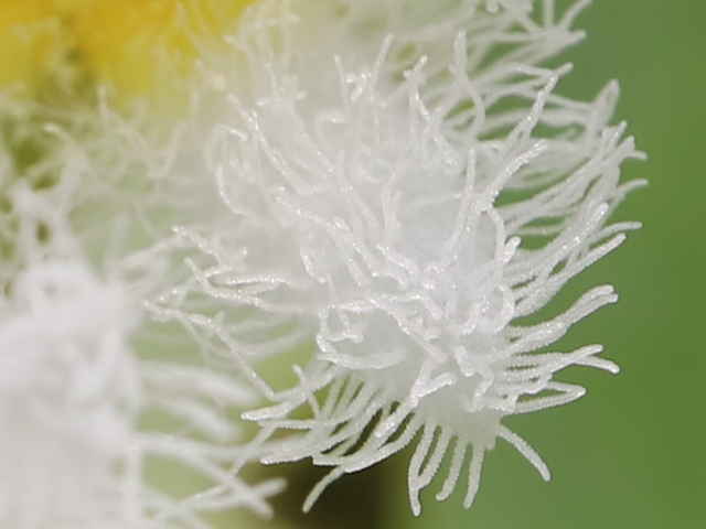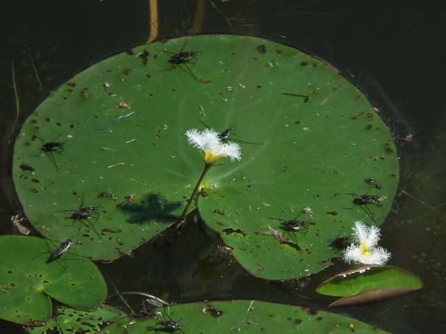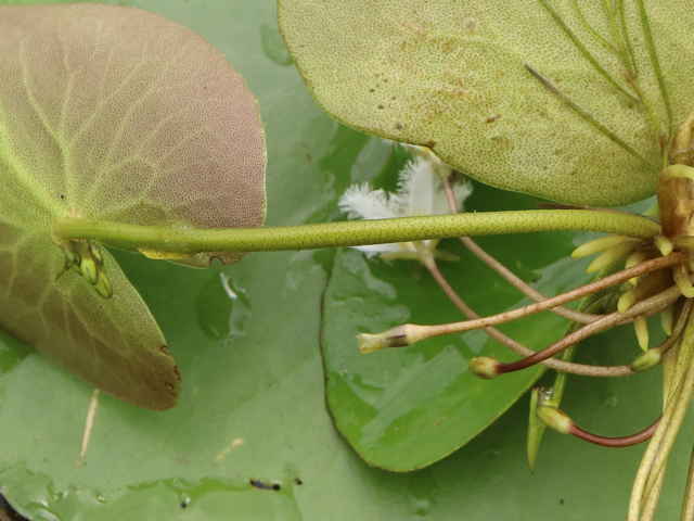 | 多年草 本州〜九州の湖沼やため池などに群生する。茎は細くて長く、1〜3個の葉をつける。葉身は広楕円形または卵状円形で径4〜20cm、基部は深い心形、全縁、裏面は紫色、微小な腺点がある。葉柄は長さ1〜2cmで、基部はやや耳状になり花序の基部を抱く。花は葉柄の基部に数個〜多数束生する。花柄は長さ3〜10cm、萼裂片は卵形で長さ4〜6mm。花冠は白色で、径約15mm、裂片の内面と縁に長い毛が密生する。株により長花柱花と短花柱花がある。さく果は楕円形で長さ4〜5mm。種子は広楕円形で光沢があり、長さ0.8mm。花期は7〜9月。(日本の野生植物) 学名は、Nymphoides indica ミツガシワ科アサザ属 よく似たヒメシロアサザは花の縁にだけ白毛がある。 |