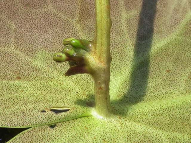 | ▼粒状の腺点がある。 | ▼短い葉柄の基部に花(蕾)がつく。 | |
